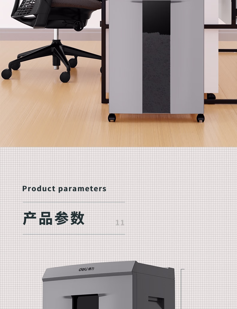 包装清单  :   得力(deli)碎纸机 5级高保密商务大型办公文件粉碎大吞吐长时间碎纸家用 碎光盘单次16张连碎60分钟30L9906