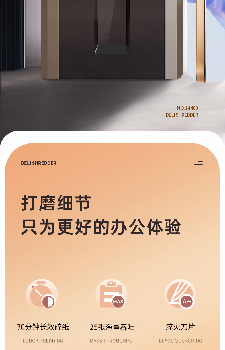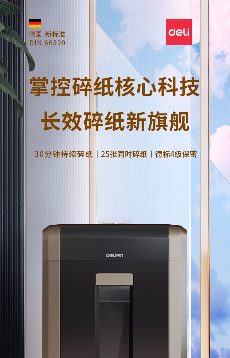 包装清单  :   得力4级办公碎纸机 大吞吐大型商务办公家用文件粉碎机 单次25张 持续30分钟 31L 碎卡碎光盘 14403
