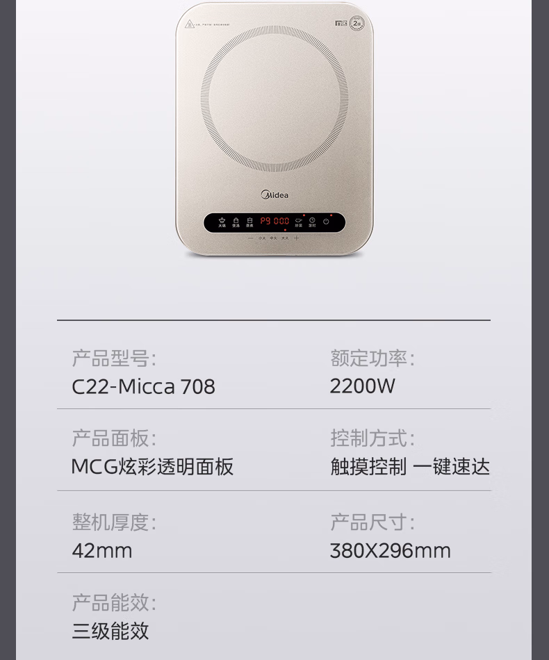 包装清单  :   美的(Midea)电磁炉电陶炉 家用2200W大功率 恒匀火加热 电磁灶火锅炉爆炒定时电磁炉 C22-Micca708