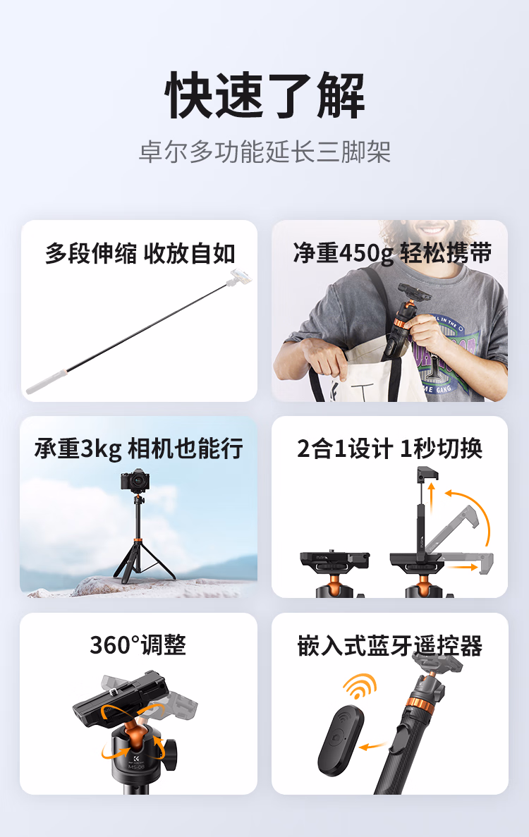 包装清单  :   卓尔(K&F CONCEPT)适配大疆nano360全景相机action5pro/4运动相机自拍杆影石X5手持杆手机自拍杆相机三脚架