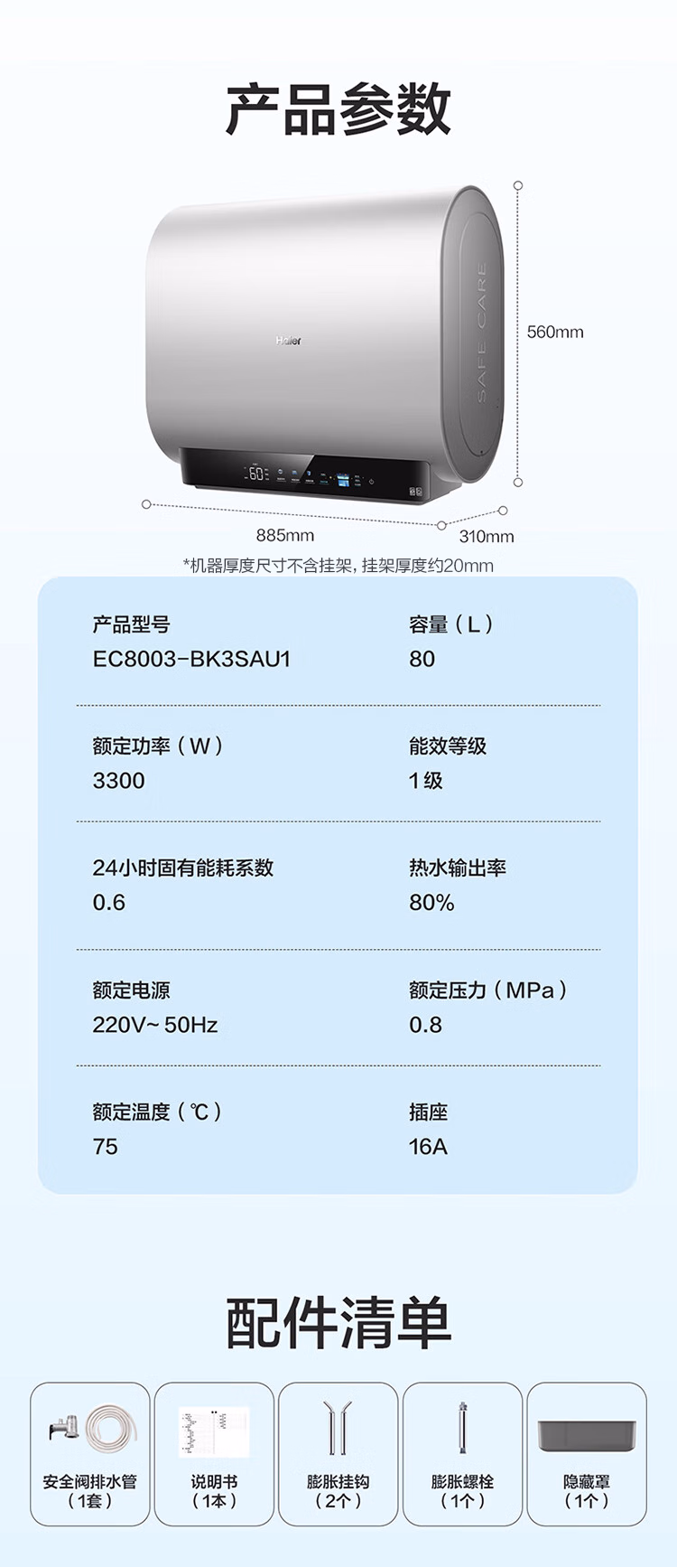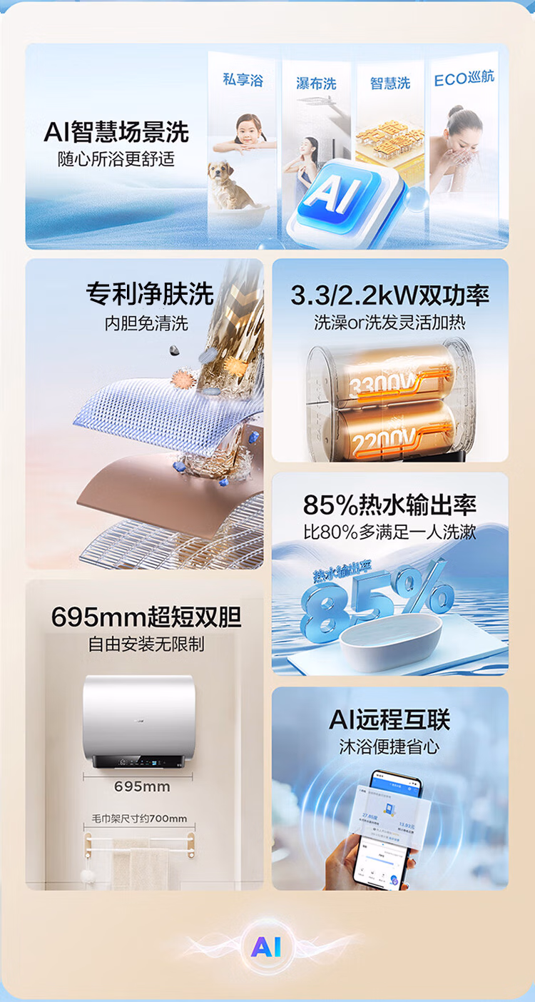 包装清单  :   双胆扁桶电热水器60升 BK3S 净肤洗 AI小魔盒 3300W变频速热 一级能效节能家用大水量