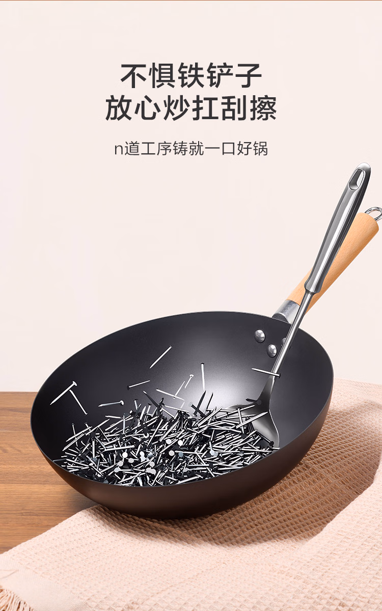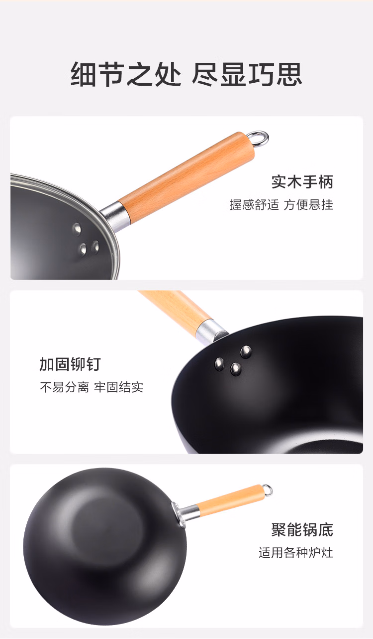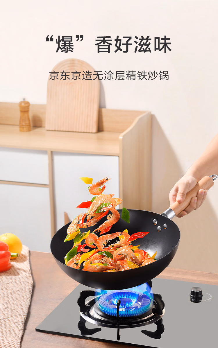 包装清单  :   京东京造 精铁炒锅 铁锅炒菜电磁炉燃气灶通用【健康无涂层】32cm无盖