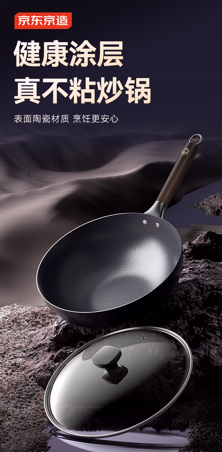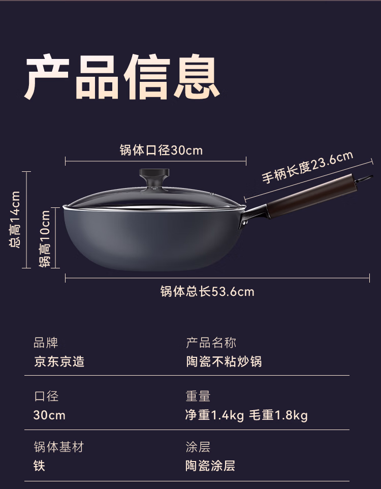 包装清单  :   京东京造 陶瓷铁锅 家用炒菜熟铁不粘锅 磁炉通用【健康无涂层】带盖 30cm