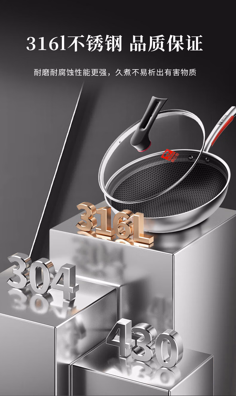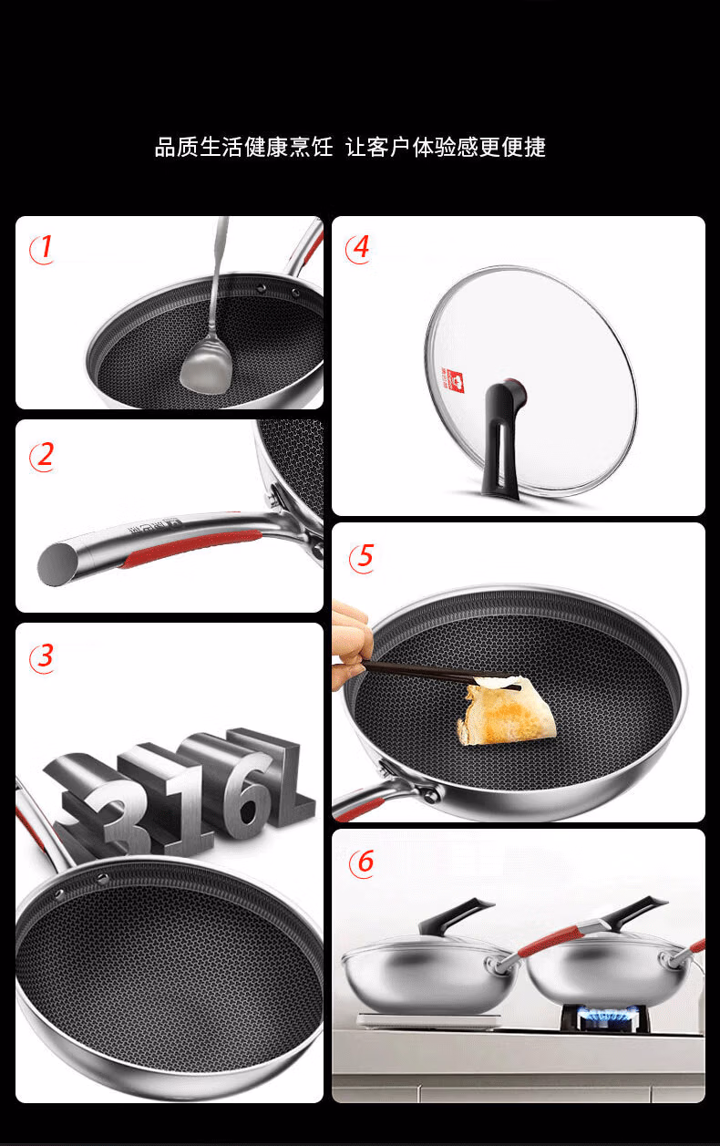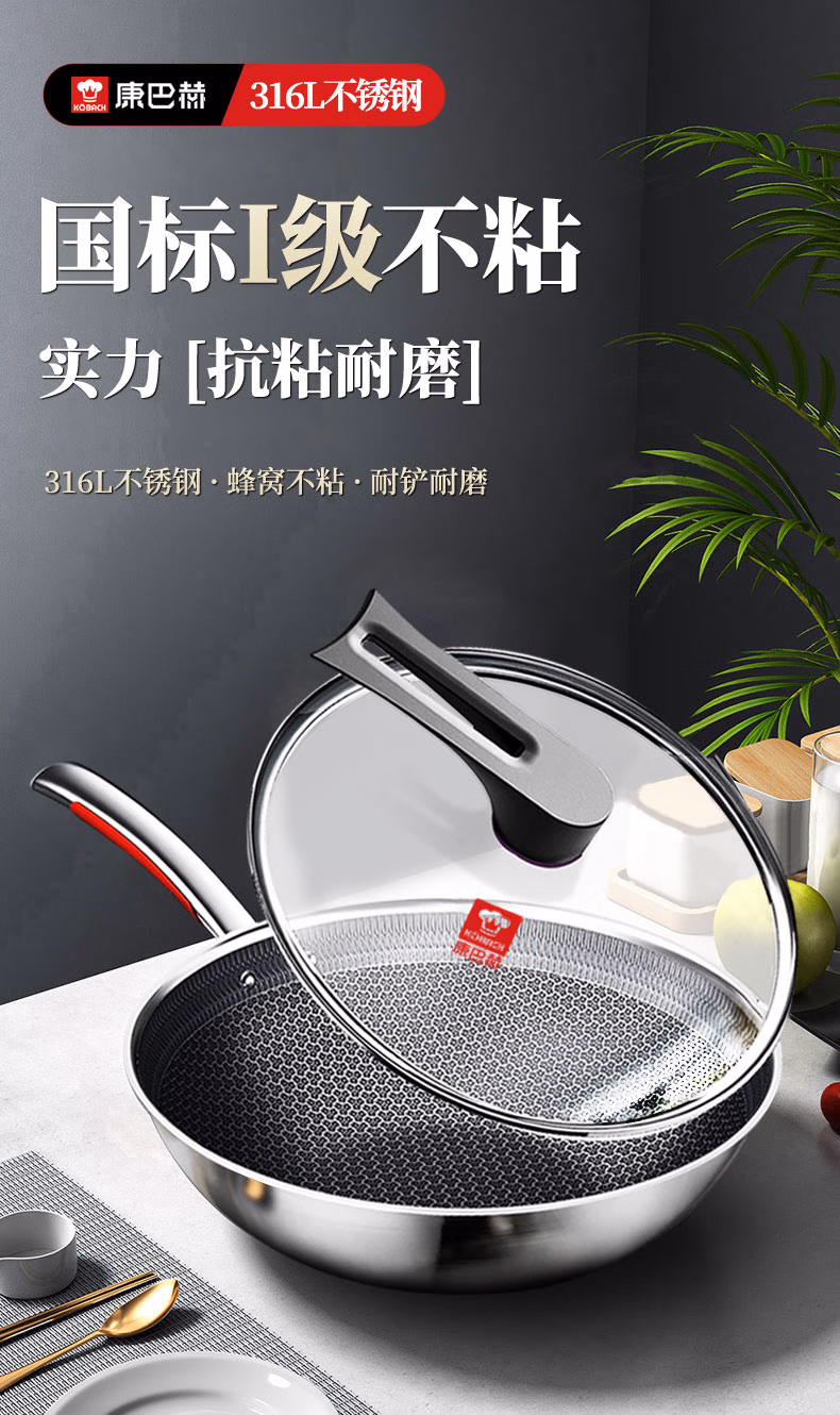 包装清单  :   康巴赫炒锅不粘锅316L不锈钢炒菜锅32cm蜂窝平底煎炒锅电磁炉燃气灶通用