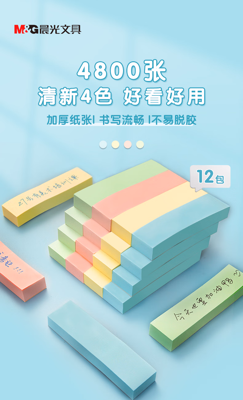 包装清单  :   晨光(M&G)文具4800张彩色索引便利贴标签贴 便签贴纸粘性小条标记书签贴便条纸 办公用品4色76*19mm
