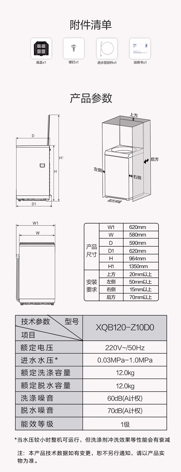 包装清单  :   海尔(Haier)全自动波轮洗衣机12公斤大容量家用XQB120-Z10D0