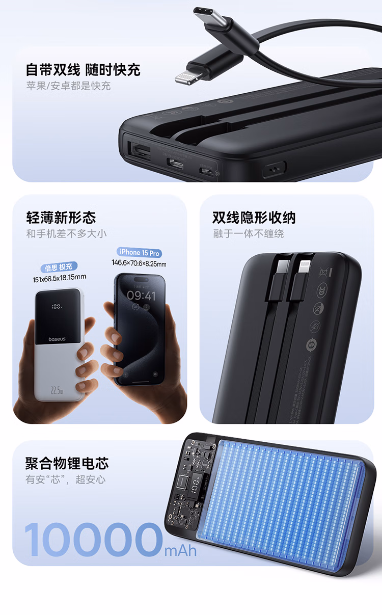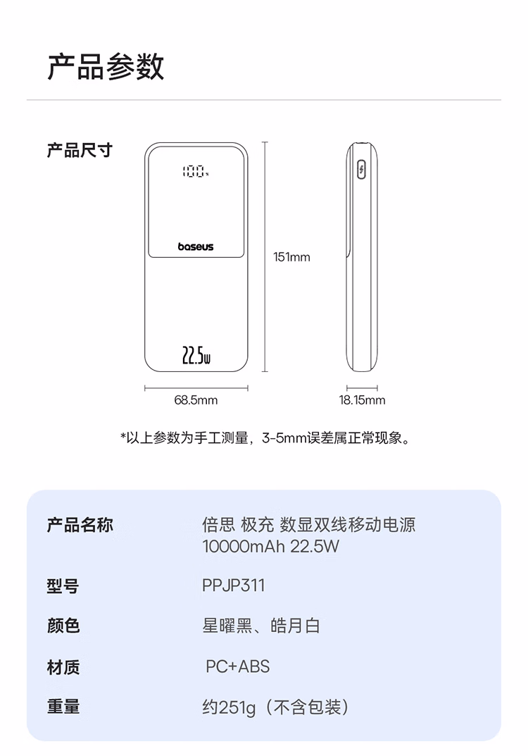 包装清单  :   倍思(Baseus)【国标3C认证】充电宝自带线10000毫安22.5W/20W快充移动电源