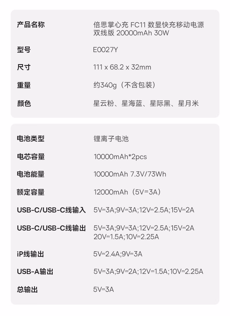 包装清单  :   倍思【国标3C认证可上飞机】充电宝20000毫安自带线 30W快充移动电源小巧