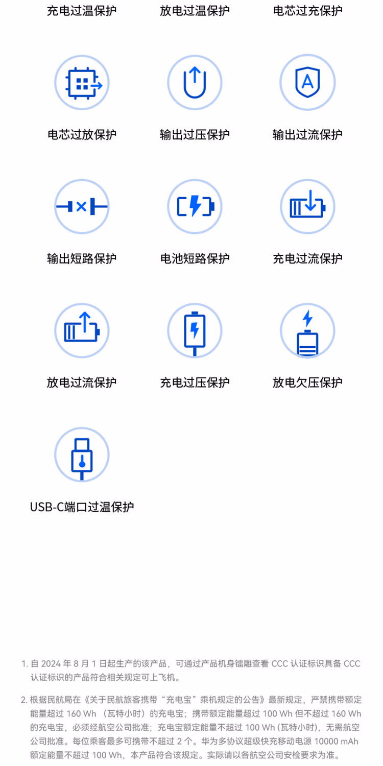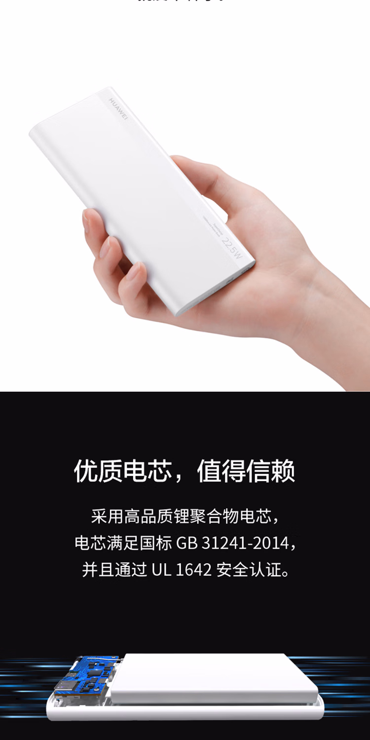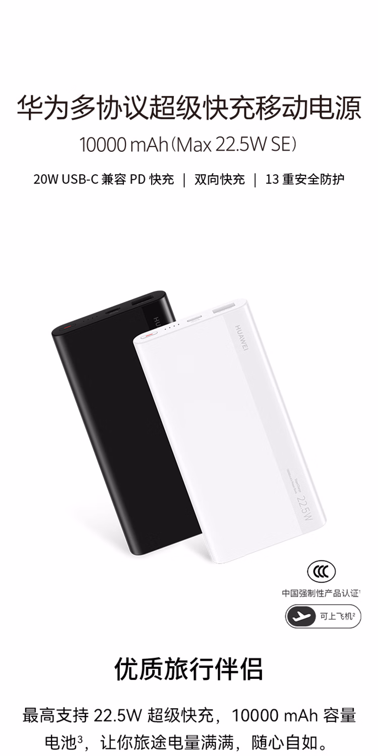 包装清单  :   华为【3C认证】原装多协议超级快充移动电源10000mAh(Max 22.5W SE) 13重安全防护 可上飞机 白色
