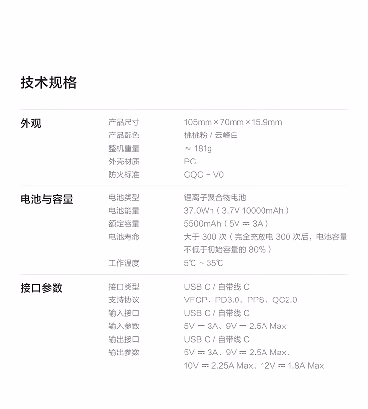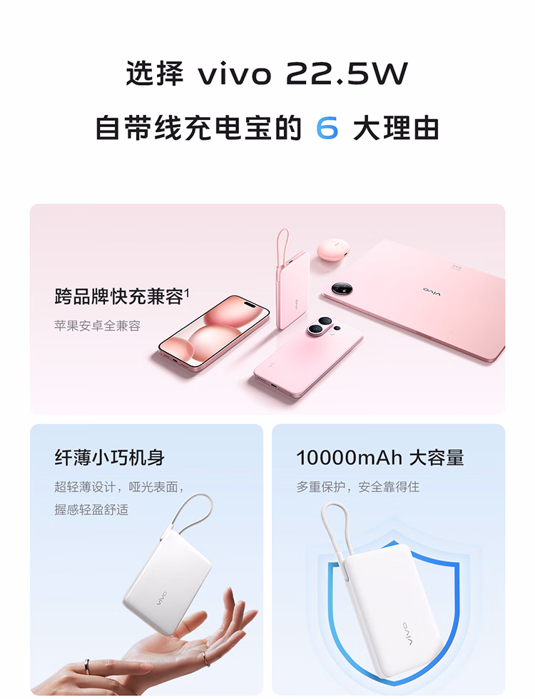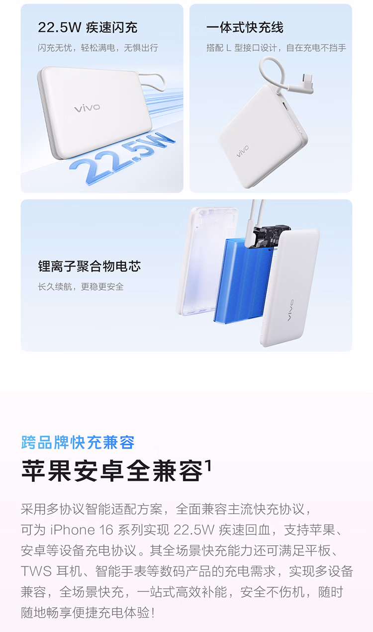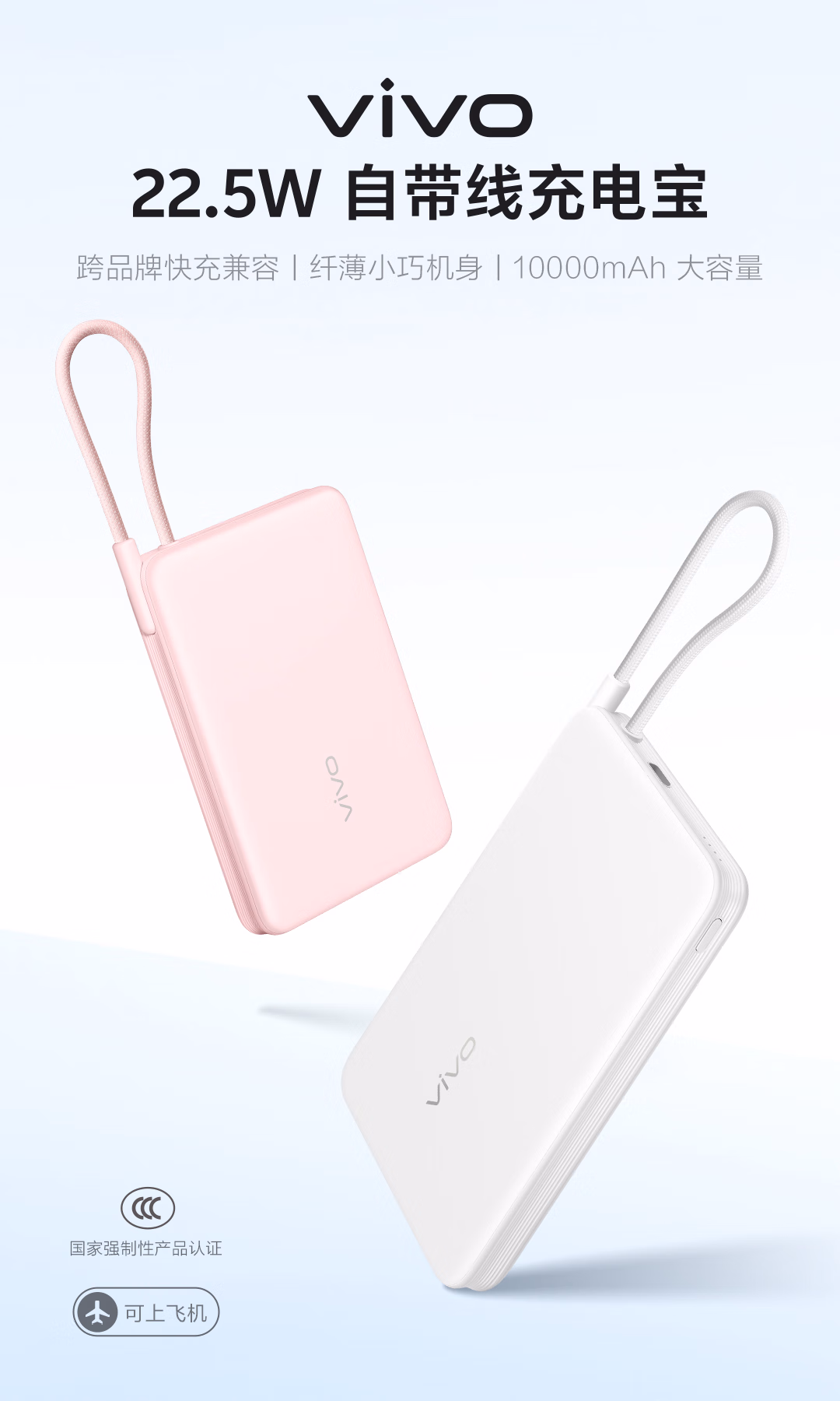包装清单  :   vivo22.5W自带线1万毫安充电宝【3C认证可上飞机】跨品牌快充兼容便携小巧