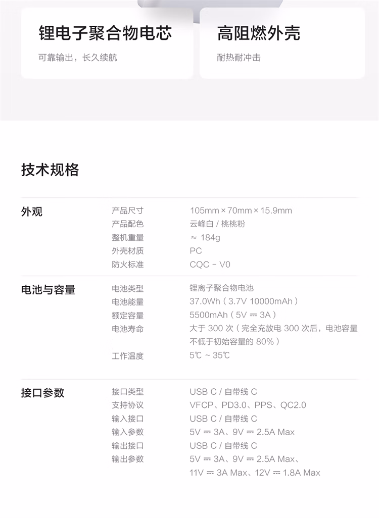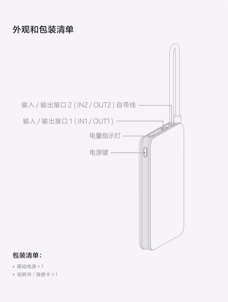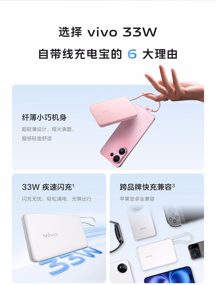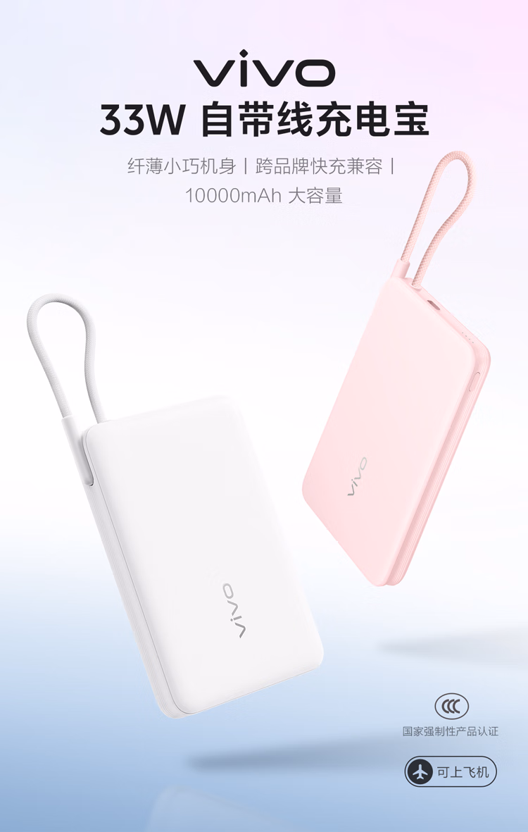 包装清单  :    vivo33W自带线充电宝1万毫安【3C认证可上飞机】纤薄小巧跨品牌快充兼容