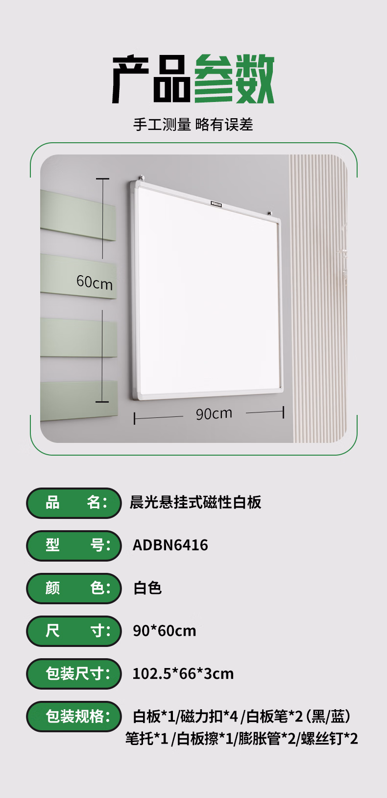 包装清单  :   晨光(M&G) 90*60cm挂式白板 蜂窝板芯 会议办公教学家用悬挂式磁性白板黑板写字板ADBN6416