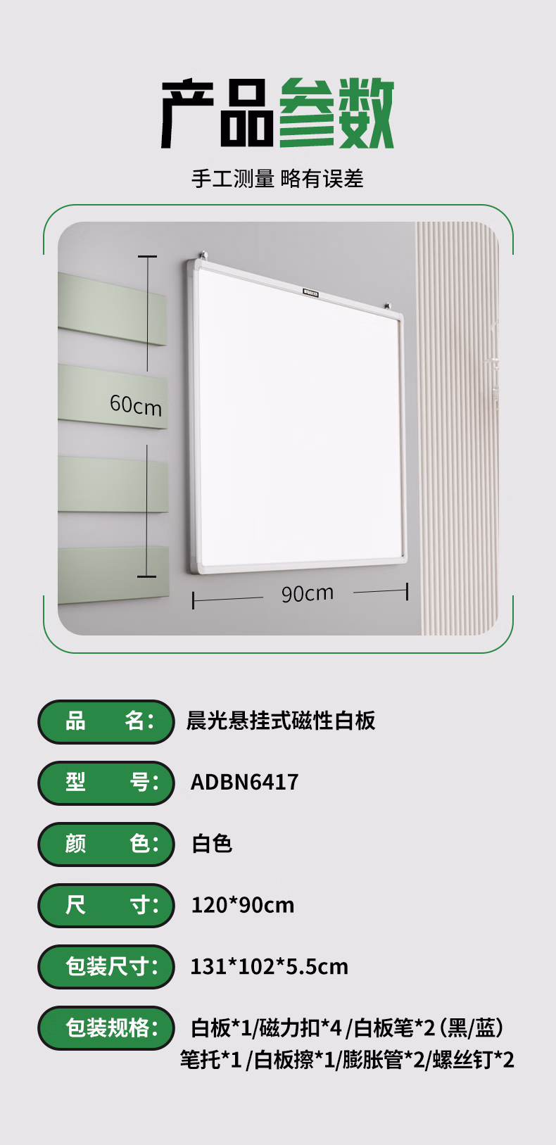 包装清单  :   晨光(M&G) 120*90cm挂式白板 蜂窝板芯 会议办公教学家用悬挂式磁性白板黑板写字板ADBN6417