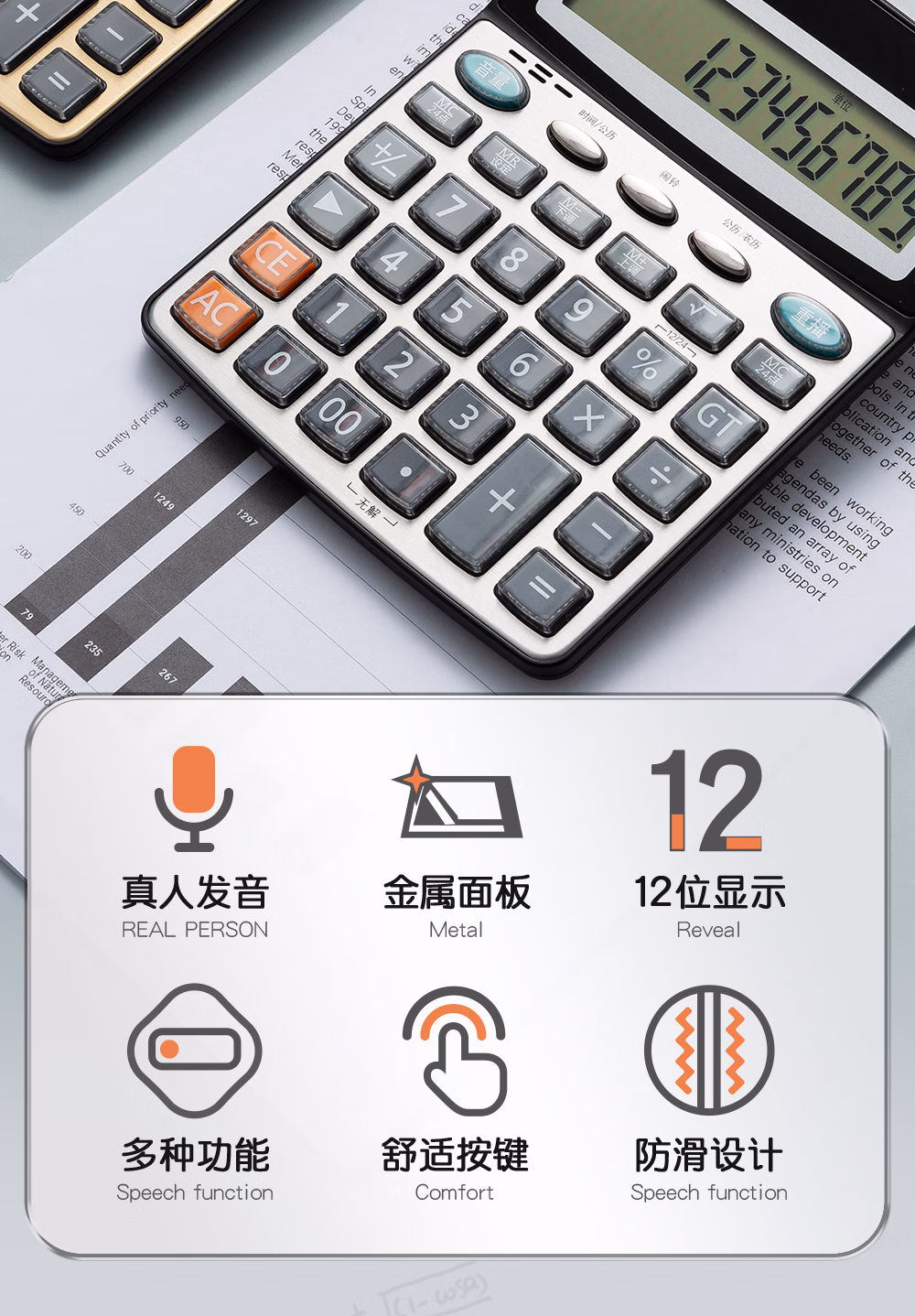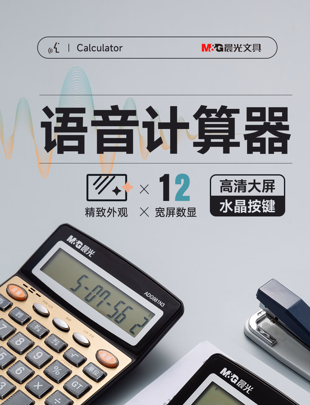 包装清单  :   晨光(M&G)文具 语音型计算器 学生/办公12位大屏幕真人语音计算器 香槟金单个装 办公用品 ADG981N3