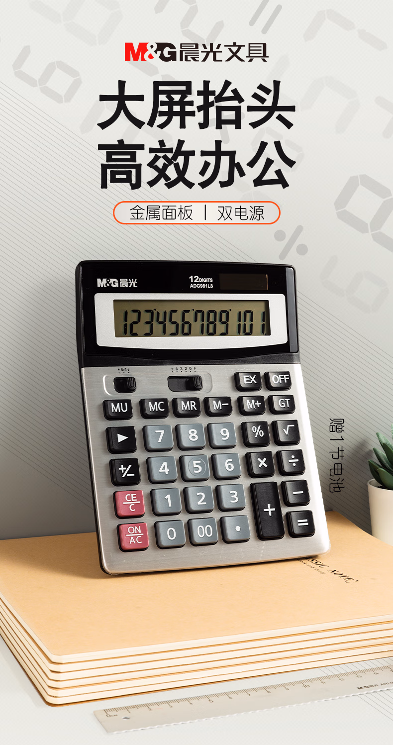 包装清单  :   晨光(M&G)文具大屏金属面板宽屏计算器 桌面计算机 学生/办公通用12位显示大屏幕计算器 ADG981L8