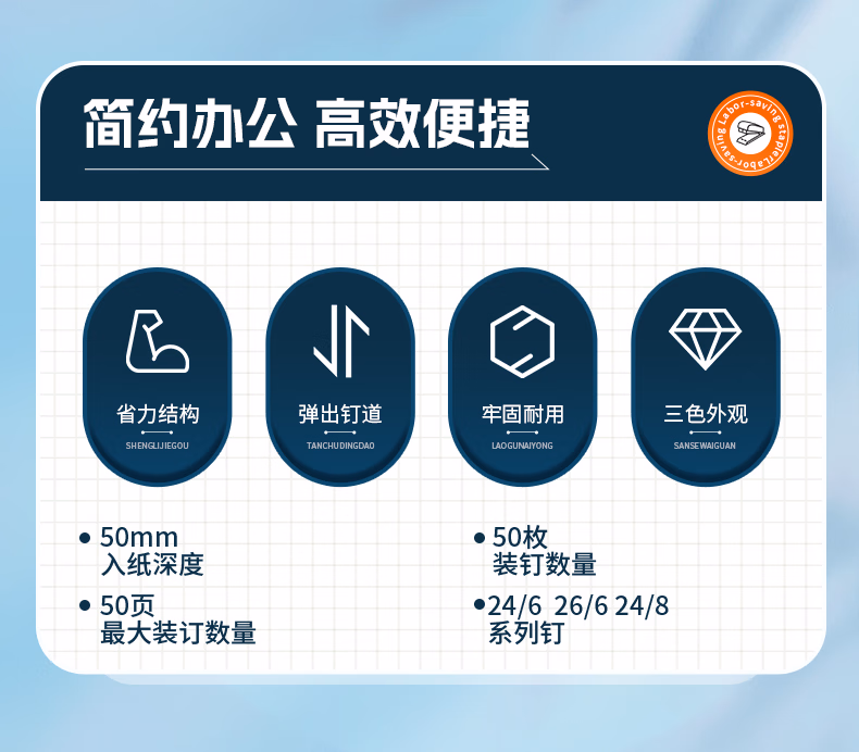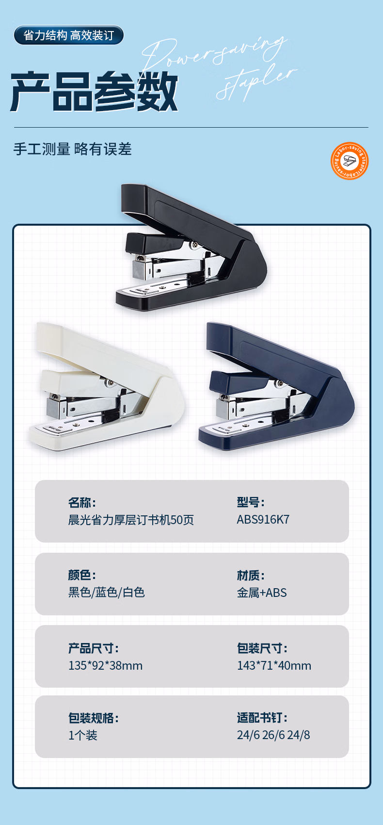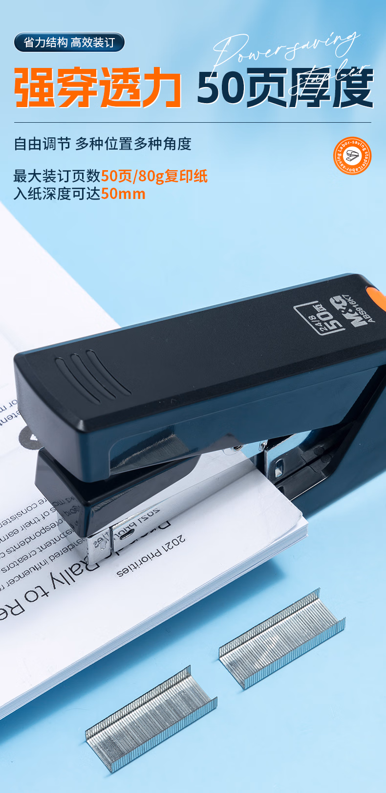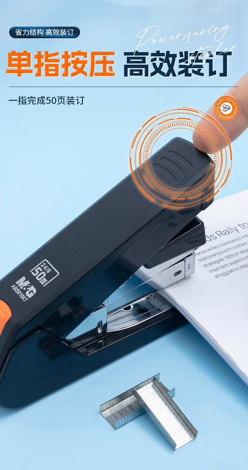 包装清单  :   晨光(M&G)50页厚层订书机 省力订书器 学生办公用品 试卷文件装订机 适配24/6 24/8钉 黑色ABS916K7开学必备