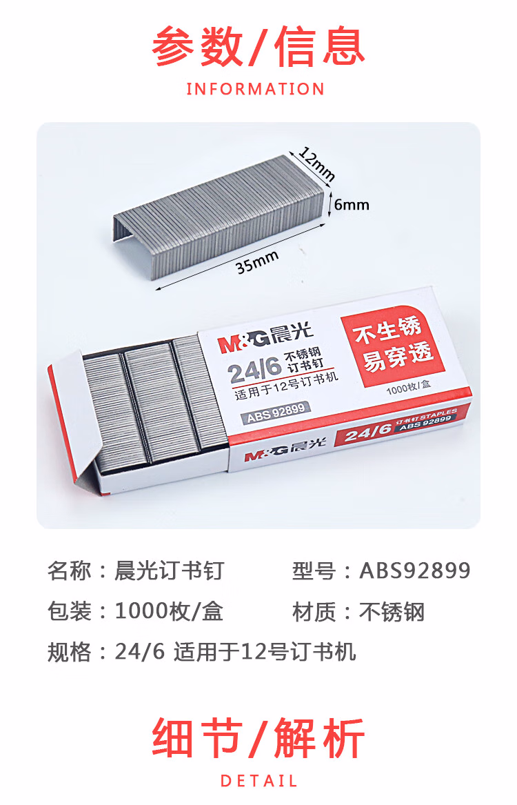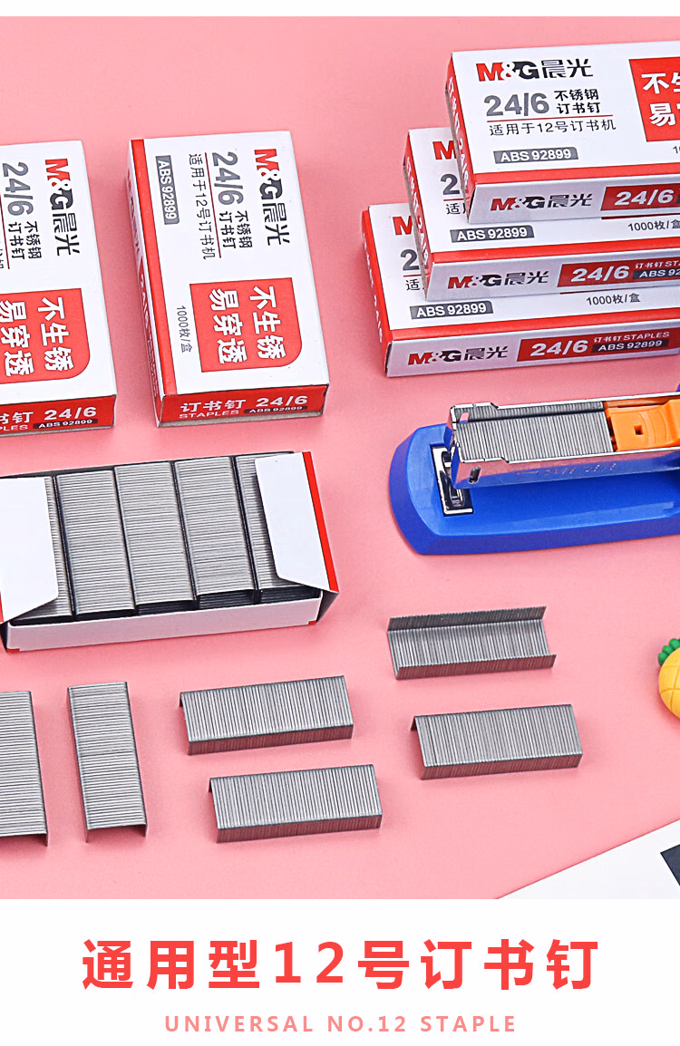 包装清单  :   晨光(M&G)24/6订书钉 12#订书针 不锈钢订书钉 1000枚/盒 单盒装 可订25页 办公用品 ABS92899