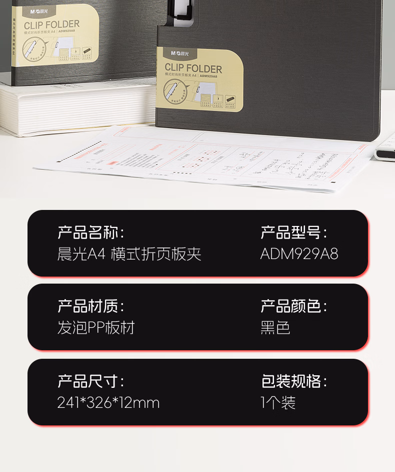 包装清单  :   晨光(M&G)文具 A4横式折页板夹会议夹 加厚硬文件夹 发泡pp材质签约夹板文件夹 试卷收纳夹菜单夹ADM929A8