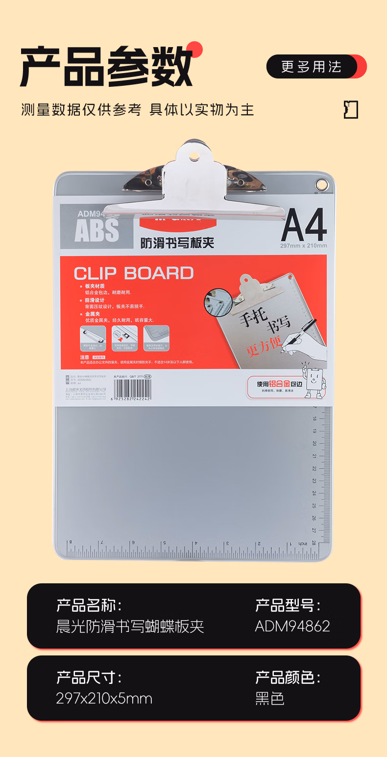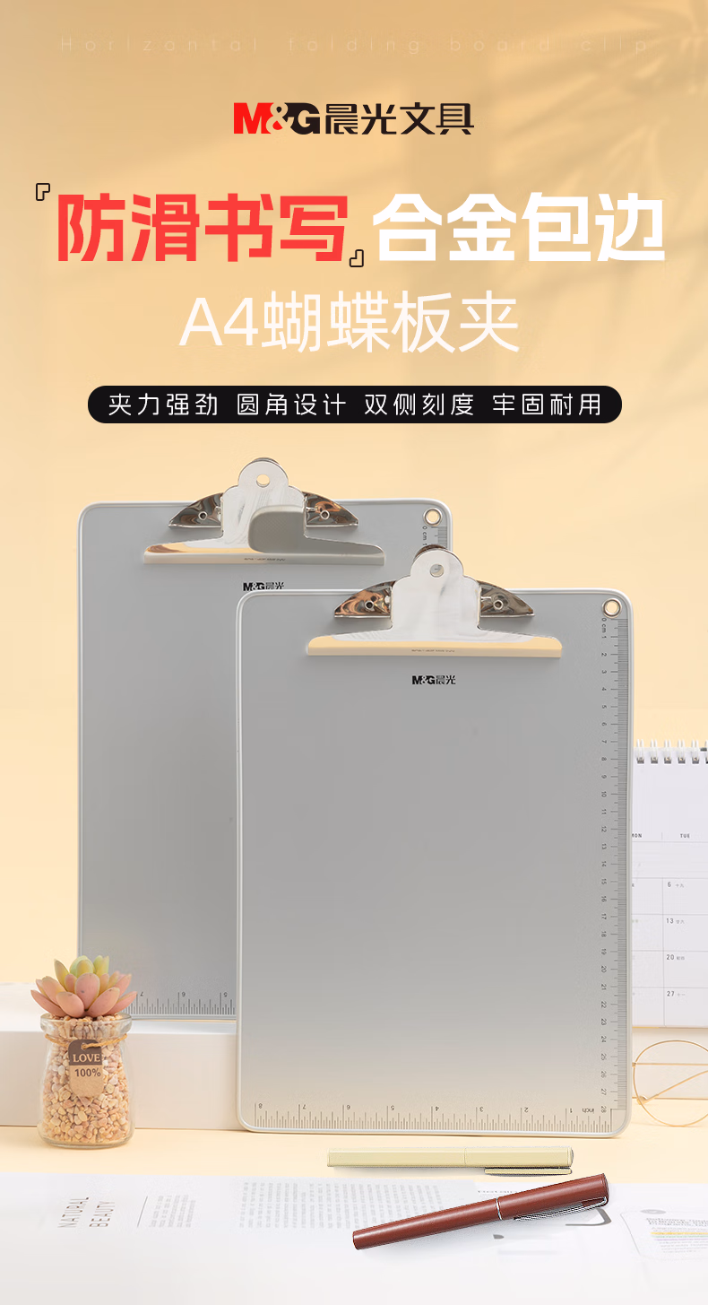 包装清单  :   晨光(M&G)文具A4银色蝴蝶夹书写板夹 记事夹(带刻度尺) 文件夹垫板 单个装ADM94862