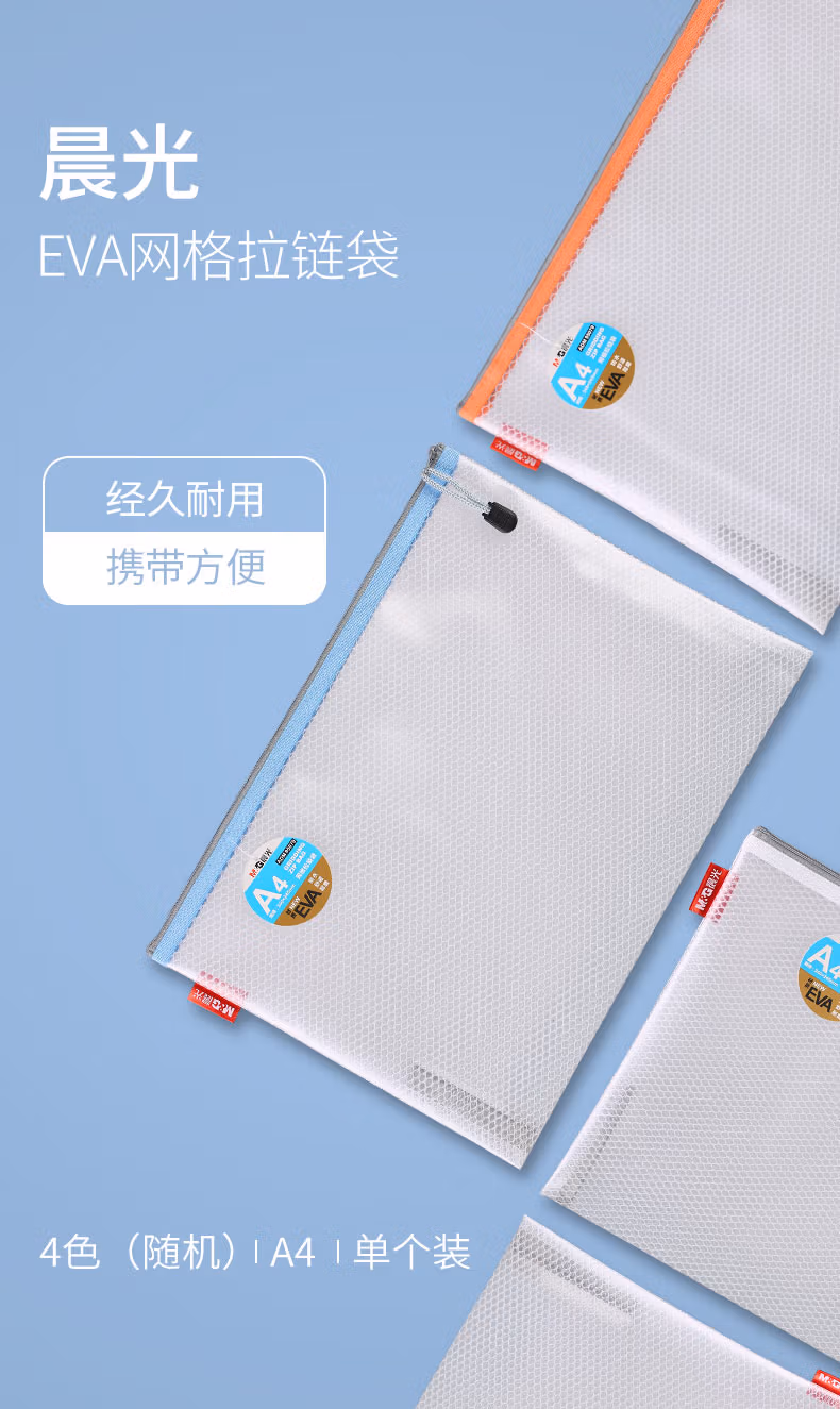 包装清单  :   晨光(M&G)文具A4/EVA文件袋资料袋 网格拉链袋 办公学生开学考试试卷票据收纳袋 单个装颜色随机ADM95079
