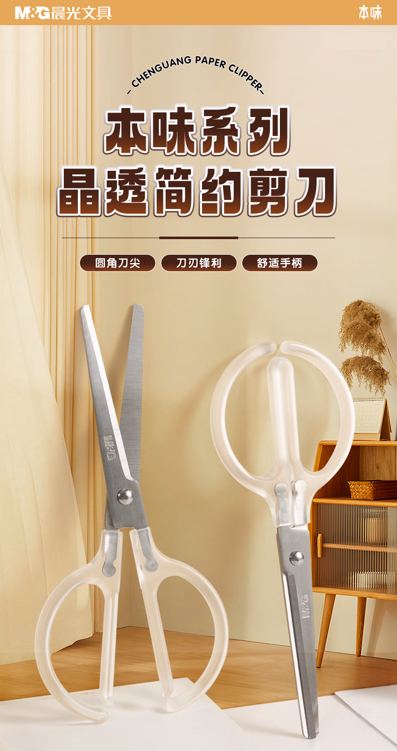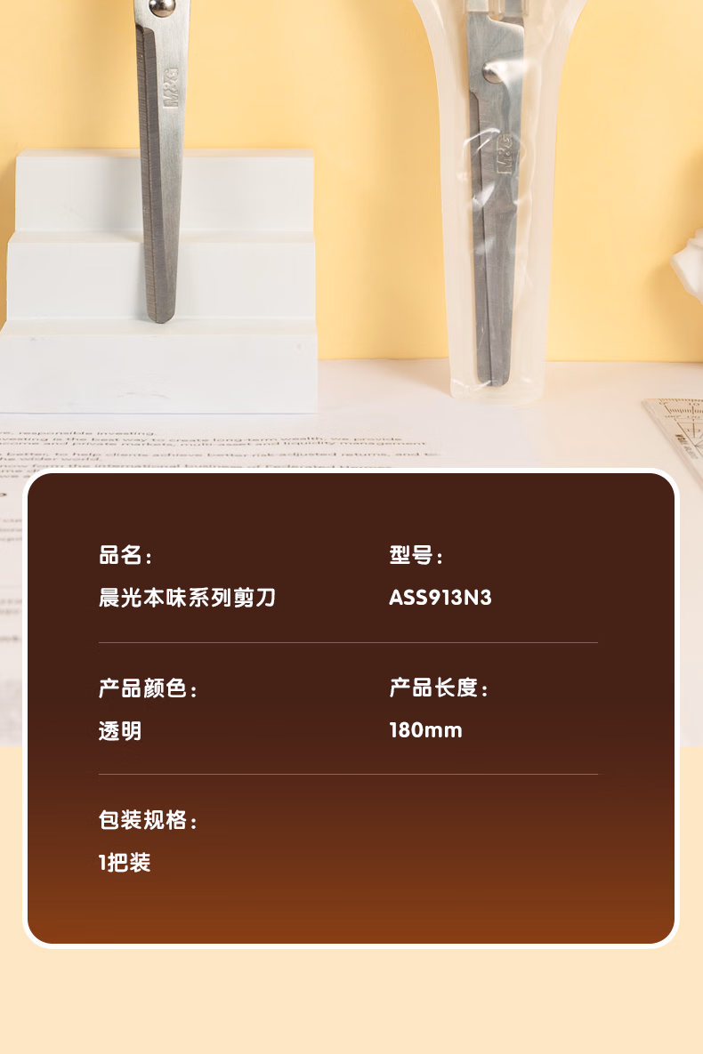 包装清单  :   晨光(M&G)文具热门商品 180mm本味系列办公家用生活剪刀 中号手工剪纸刀 办公用品 晶透ASS913N3