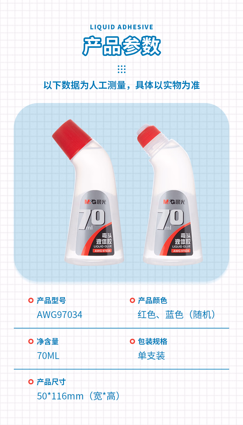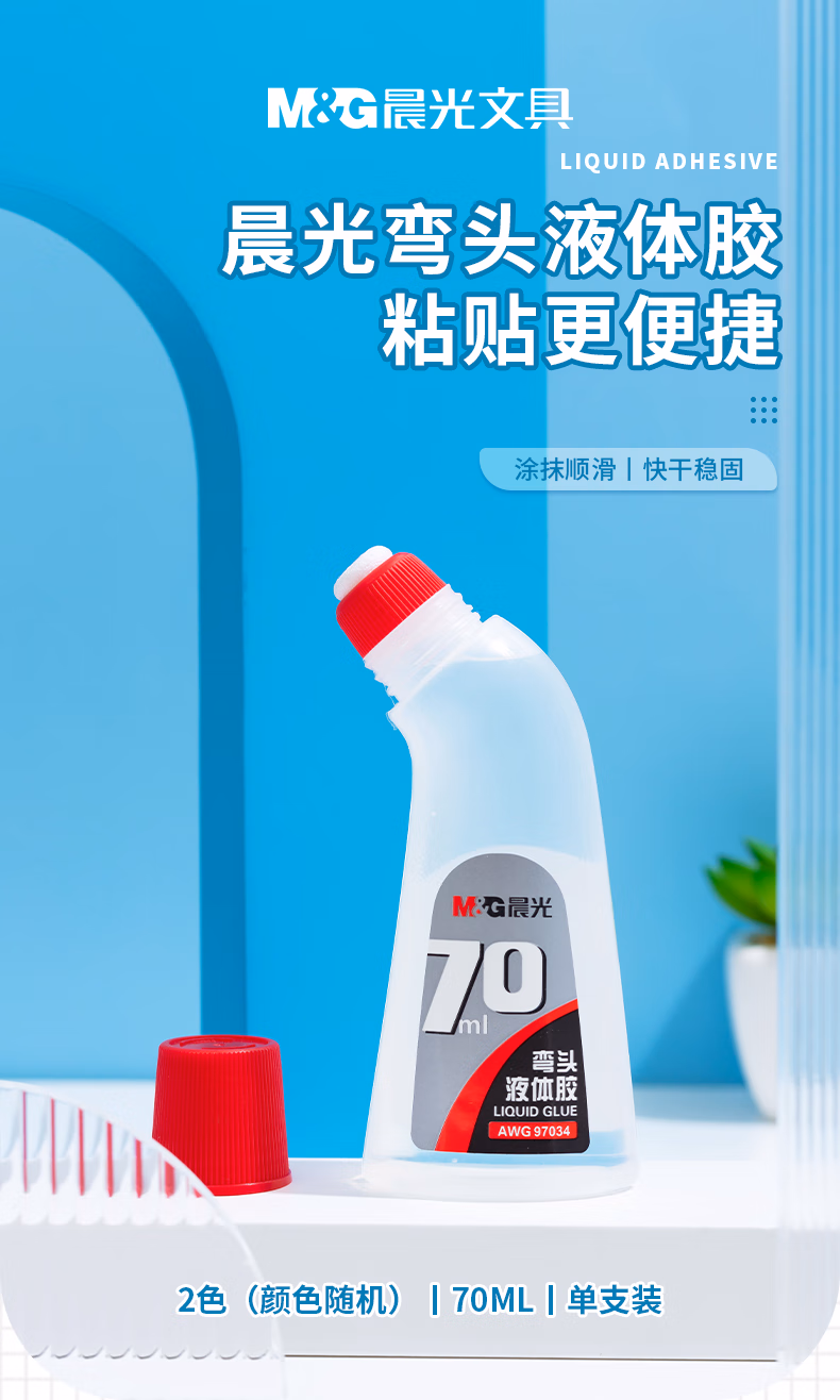 包装清单  :   晨光(M&G)文具70ml高粘度弯头液体胶 液体胶水 开学必备学生手工黏胶 办公用品 单个装颜色随机AWG97034