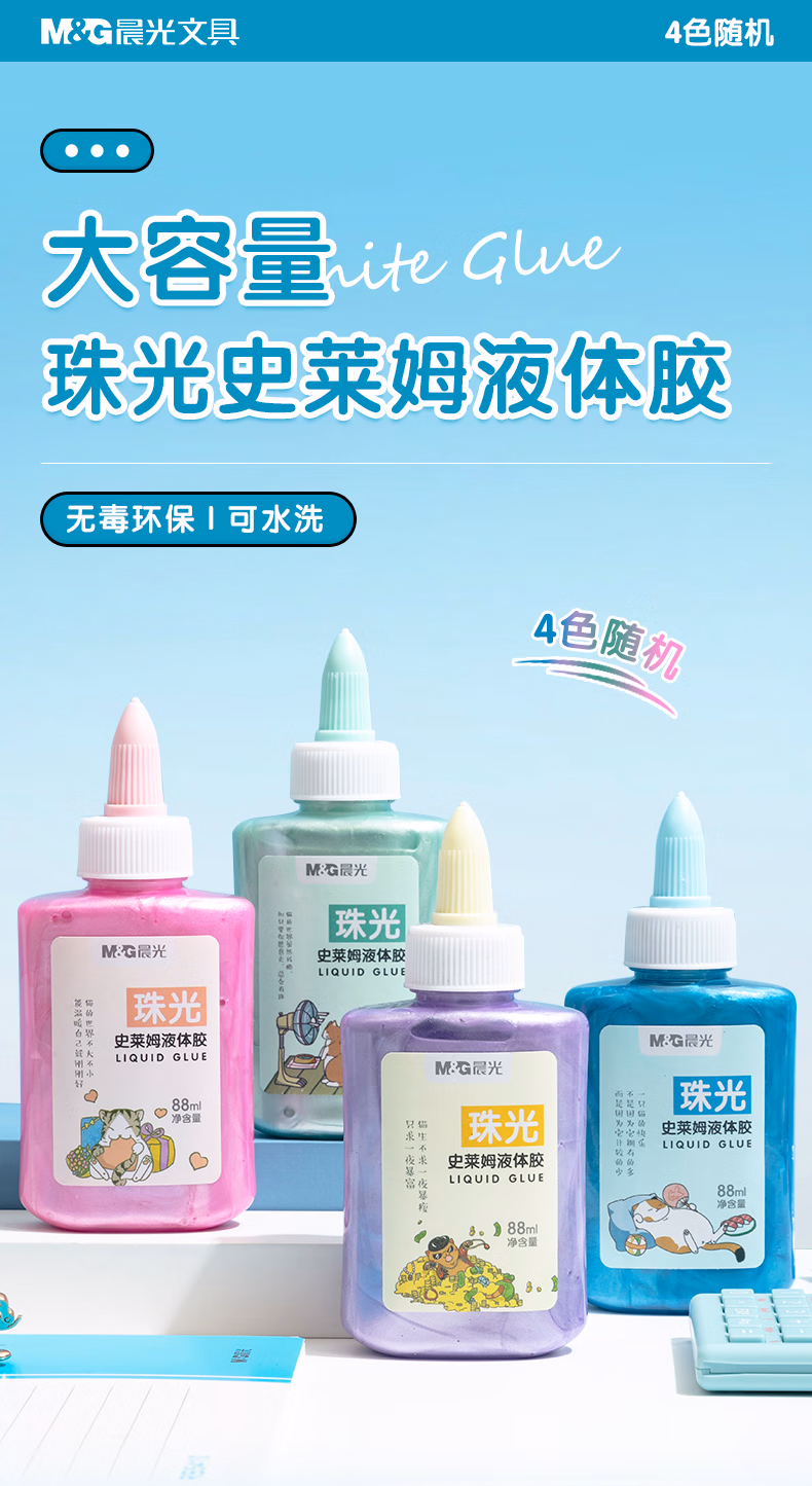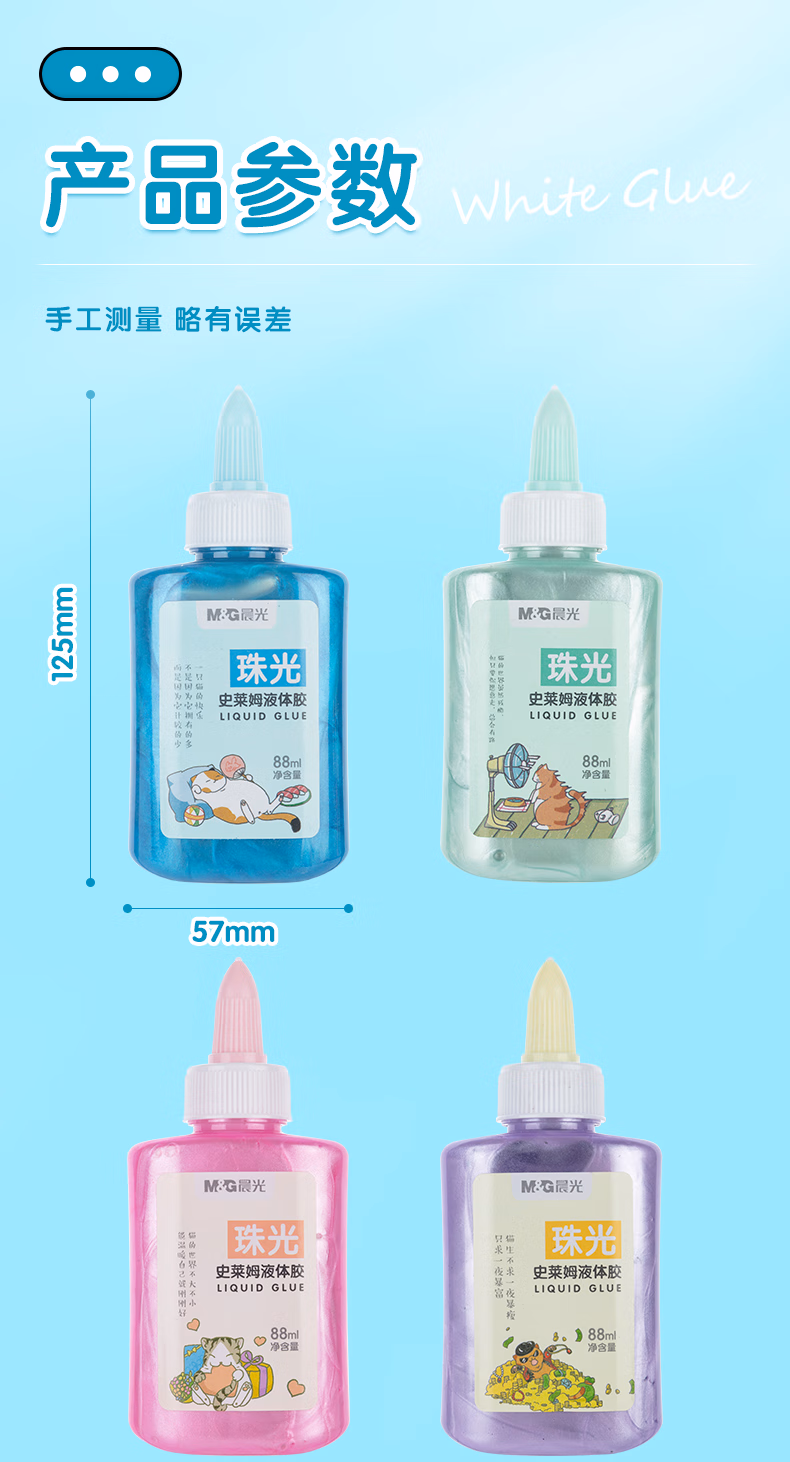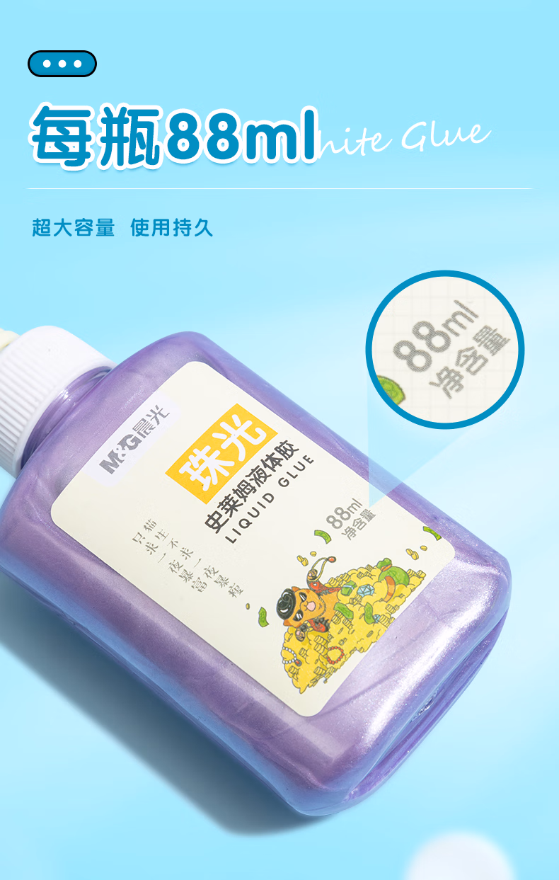 包装清单  :   晨光(M&G)文具热门商品 88ml珠光史莱姆液体胶 可水洗液体手工胶 颜色随机 AWG97062