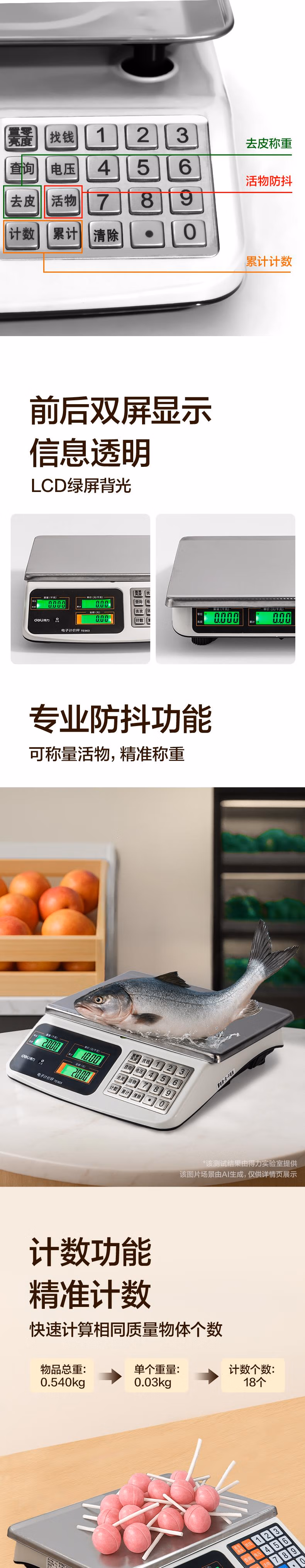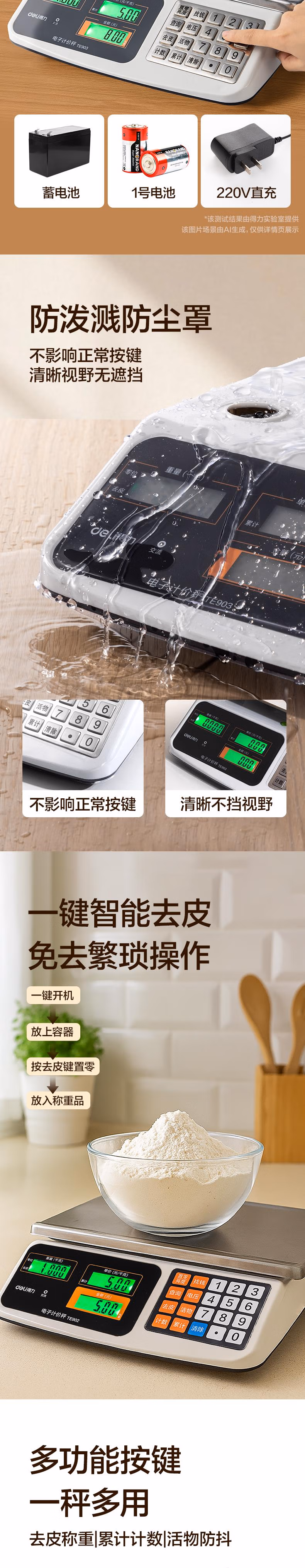 包装清单  :   得力(deli)称重电子秤商用台秤计价秤克秤30kg电子称孑秤菜场摆摊水果充电秤高精度计数秤厨房秤 TE903