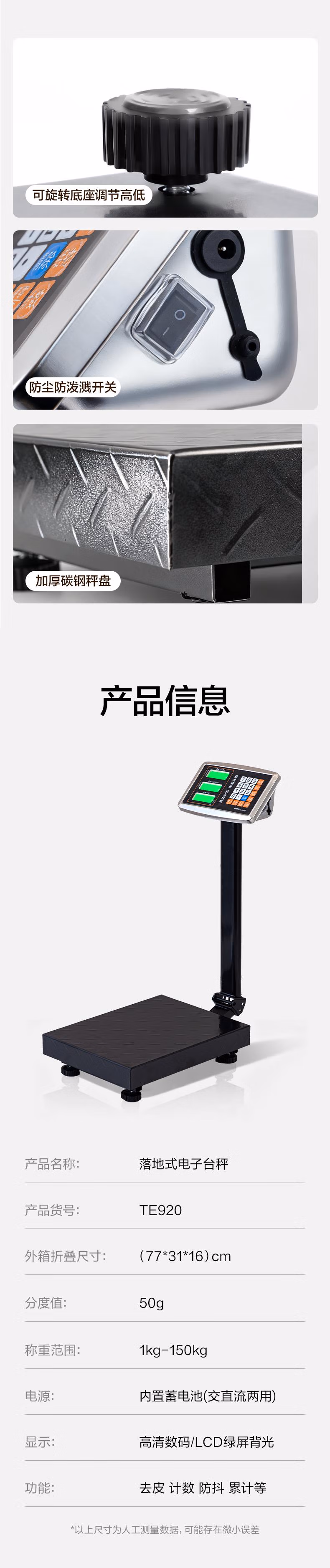 包装清单  :   得力(deli)充电台秤电子秤商用高精度落地卖菜电子称货物磅秤计价大型工业用计数快递秤 TE920