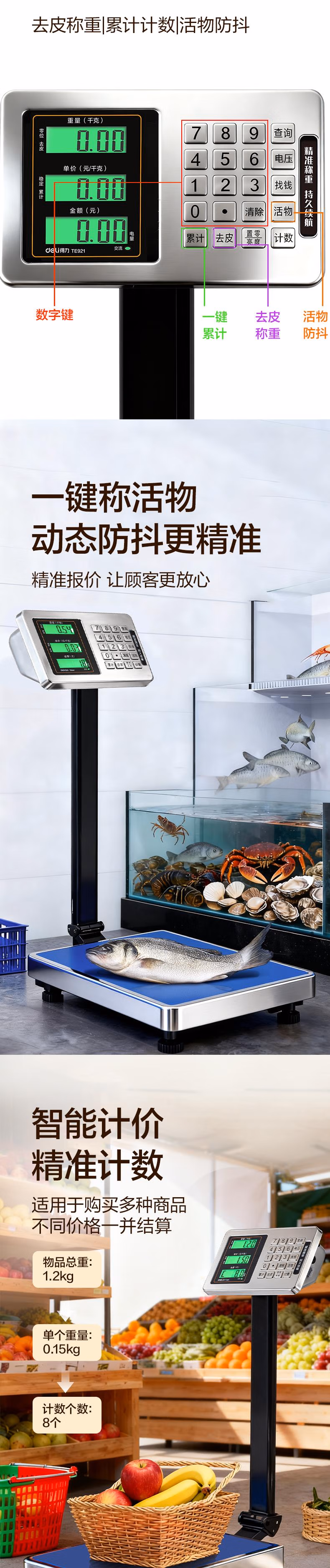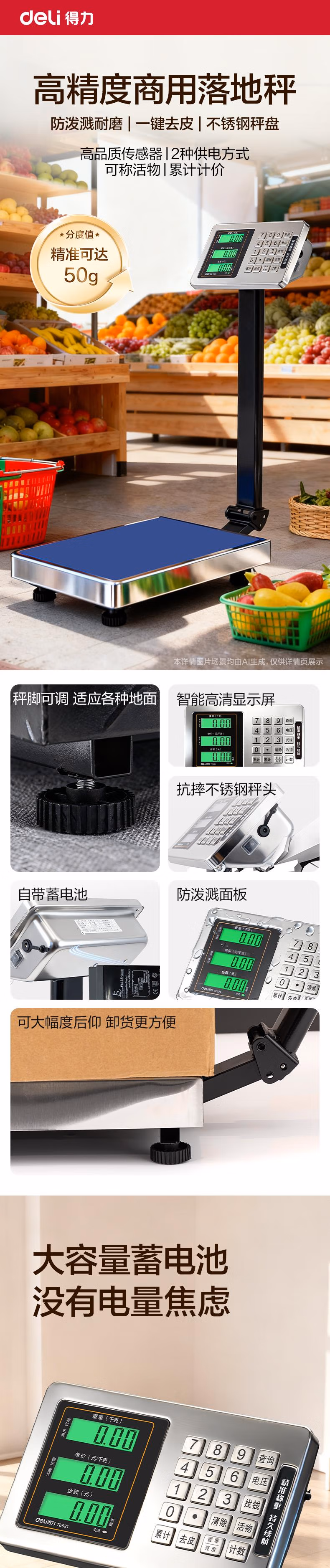 包装清单  :   得力(deli)充电台秤电子秤商用高精度落地卖菜电子称货物磅秤计价大型工业用计数快递秤 TE921