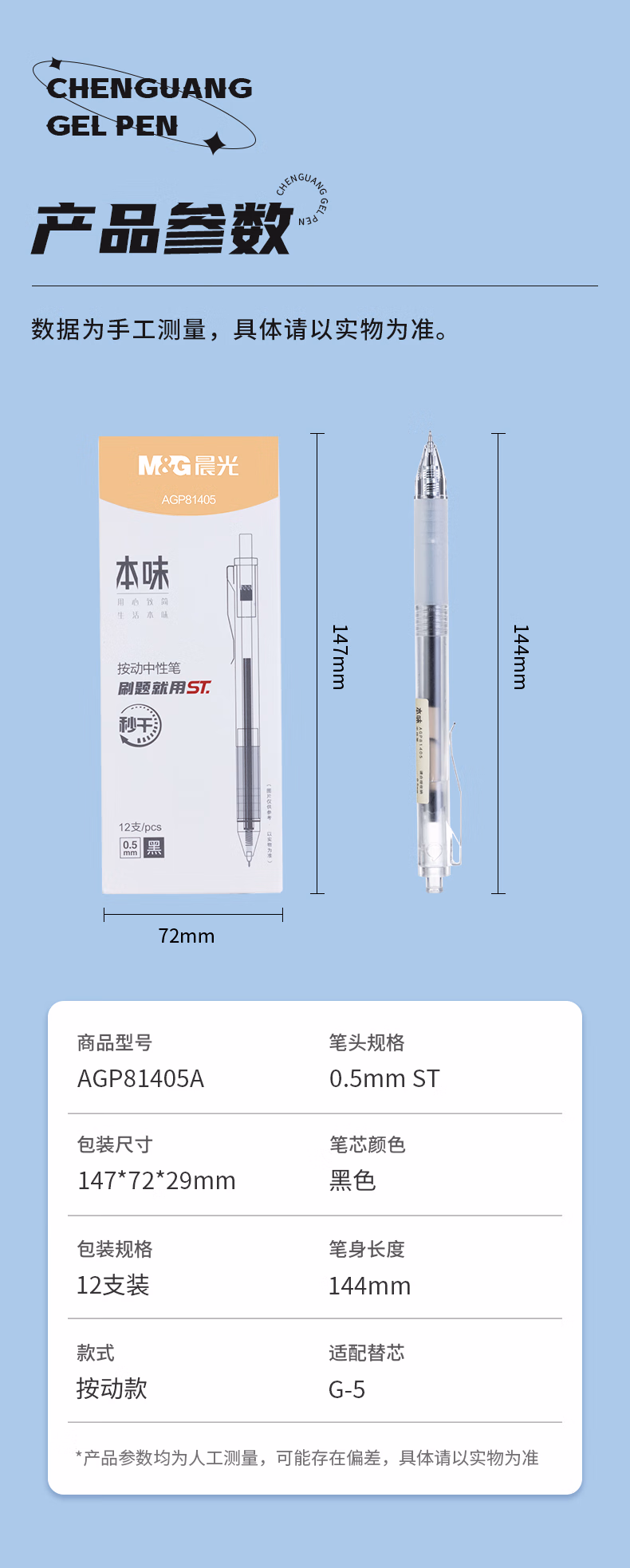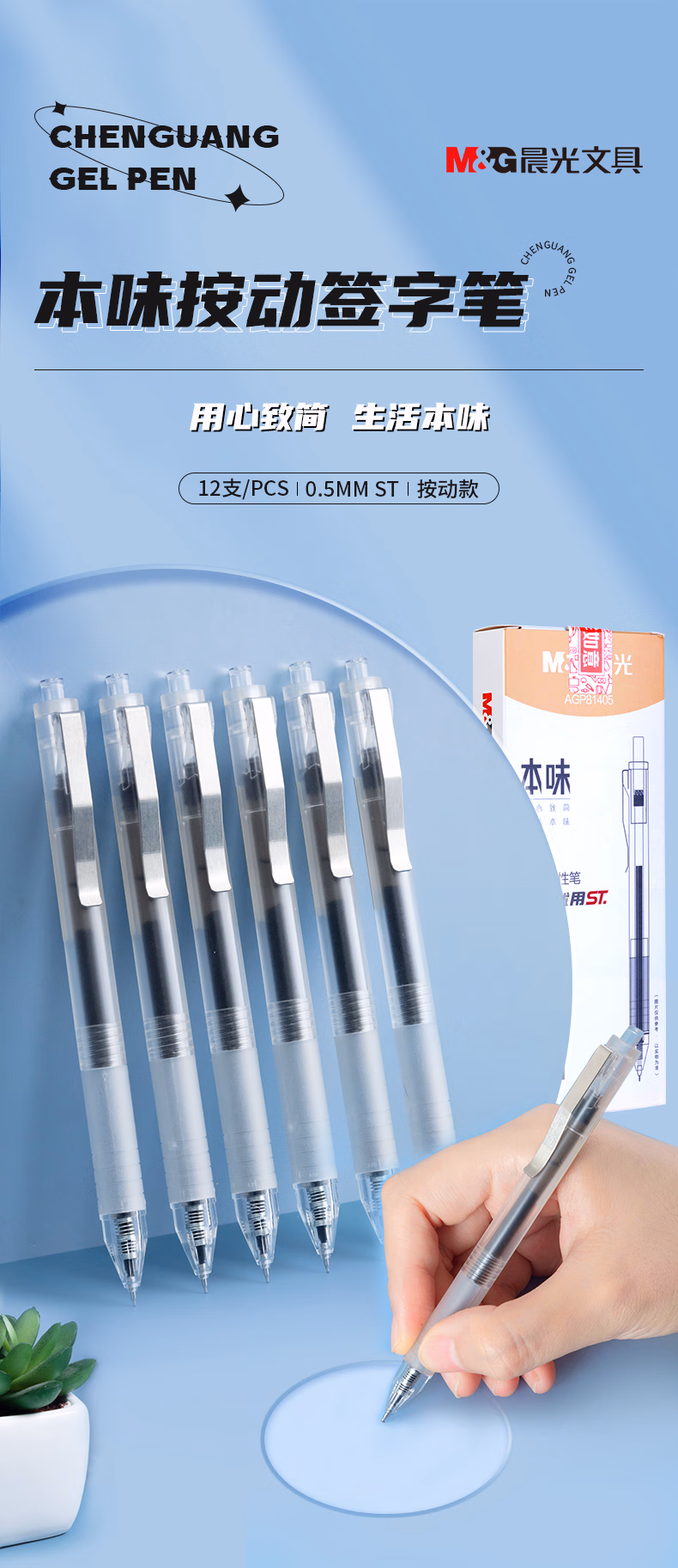 包装清单  :   晨光(M&G)文具【刷题笔】本味系列0.5mm黑色按动中性笔 全针管签字笔 学生办公水笔12支/盒AGP81405
