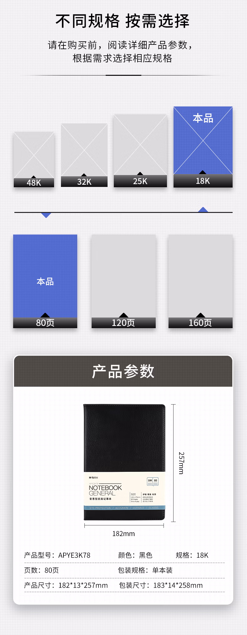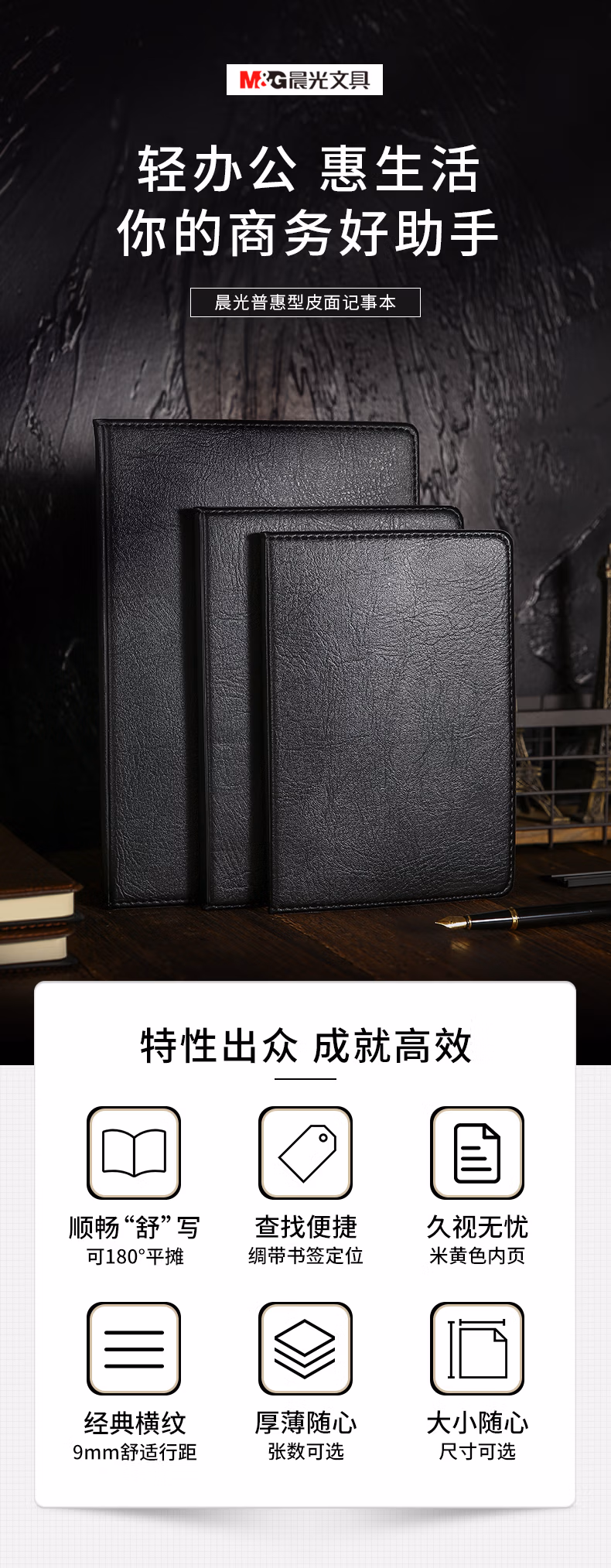 包装清单  :   晨光(M&G)黑色软皮革面笔记本本子开会办公用品会议记录本普惠型日记本记事本商务18K 80张单本APYE3K78