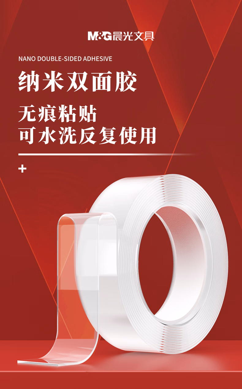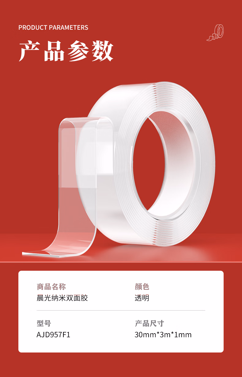 包装清单  :   晨光文具30mm*3m*1mm无痕纳米双面胶带 透明防水胶 强力春联胶贴固定贴水洗家用车用重复使用AJD957F1
