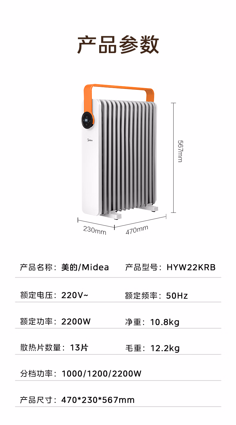 包装清单  :   美的(Midea)【暖阳系列】取暖器/电热油汀/加热电暖器/立式电暖气/家用WIFI智能遥控防烫加湿恒温 HYW22KRB
