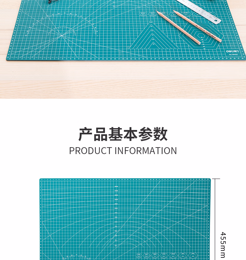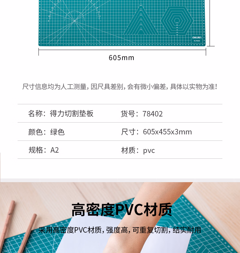 包装清单  :   得力(deli)A2耐用PVC切割垫板桌垫/鼠标垫/书写垫 超大号可水洗手工桌面刻板裁纸美工垫 绿色78402