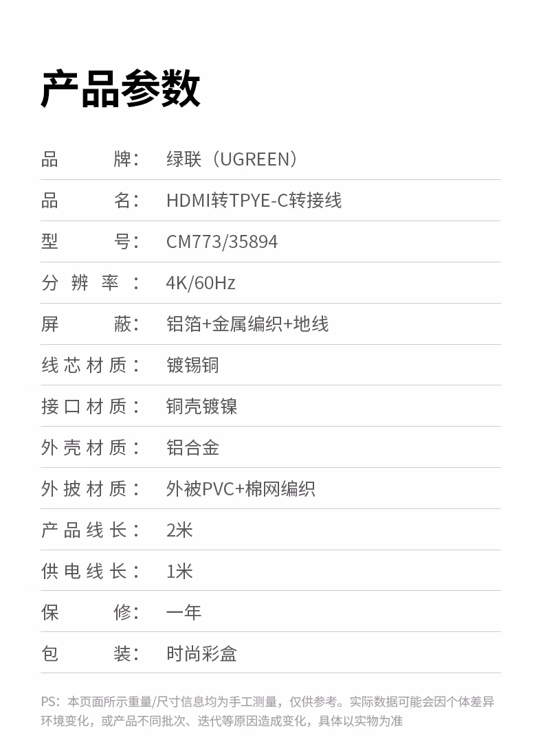 包装清单  :   绿联HDMI转Type-c转换线器带供电 4K高清转接线适用笔记本电脑PS5接显示器便携屏VR雷鸟AR眼镜2米35984