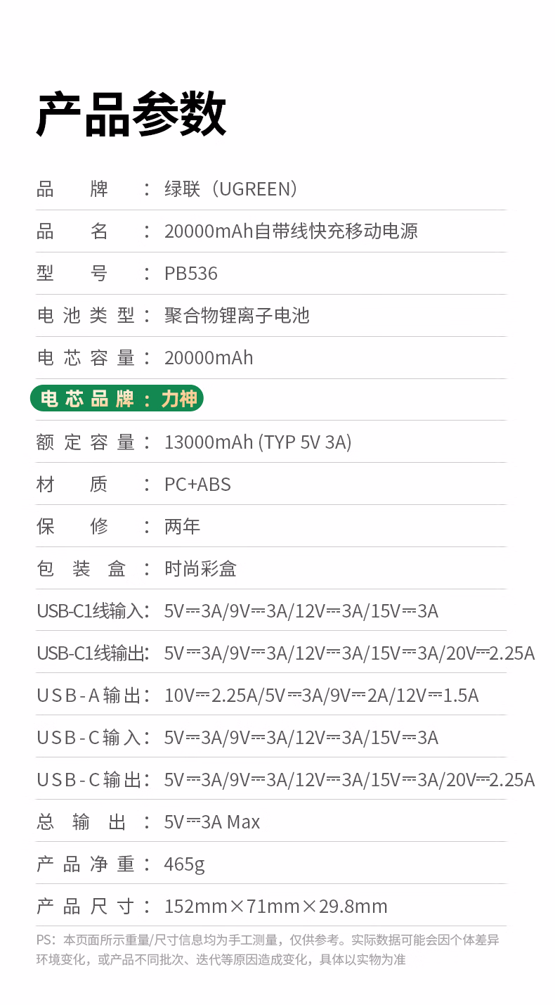 包装清单  :   绿联【3C认证可上飞机】超能块iPhone17充电宝自带线20000毫安45W快充 大容量移动电源 适用苹果16小米
