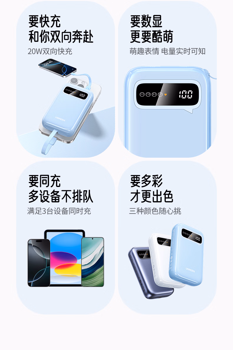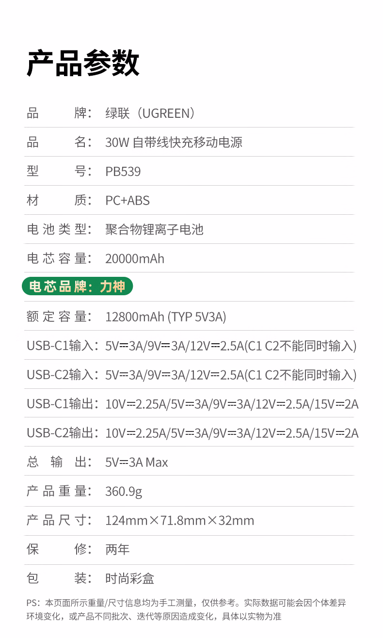 包装清单  :   绿联绿联【3C认证可上飞机】充电宝自带线20000毫安30W快充 大容量小巧移动电源 适用苹果iPhone17小米华为