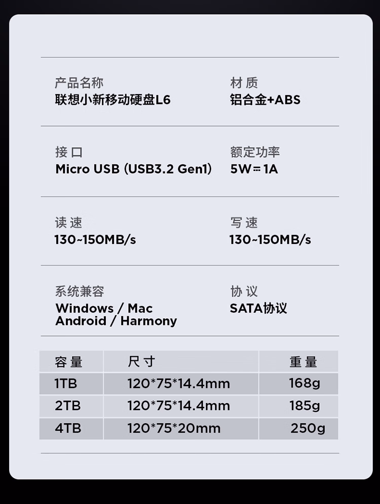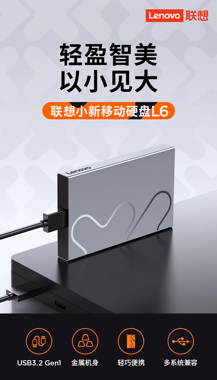 包装清单  :   联想(Lenovo)小新2TB 移动硬盘L6 USB3.2Gen1 2.5英寸机械硬盘 笔记本电脑外接文件照片备份外置存储