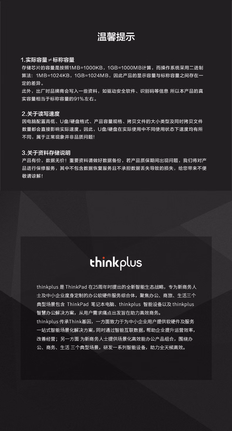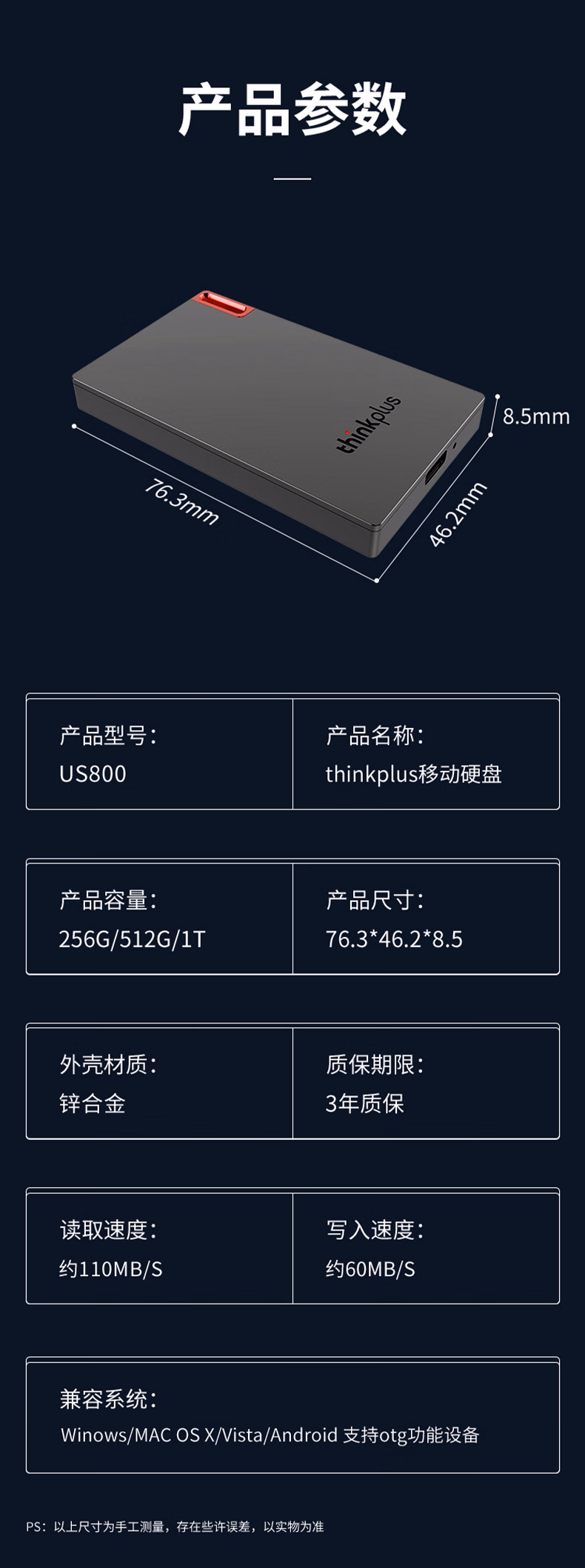 包装清单  :   ThinkPlus 联想 512G移动固态硬盘 Type-c接口PSSD移动硬盘小巧便携手机扩容盘 US800