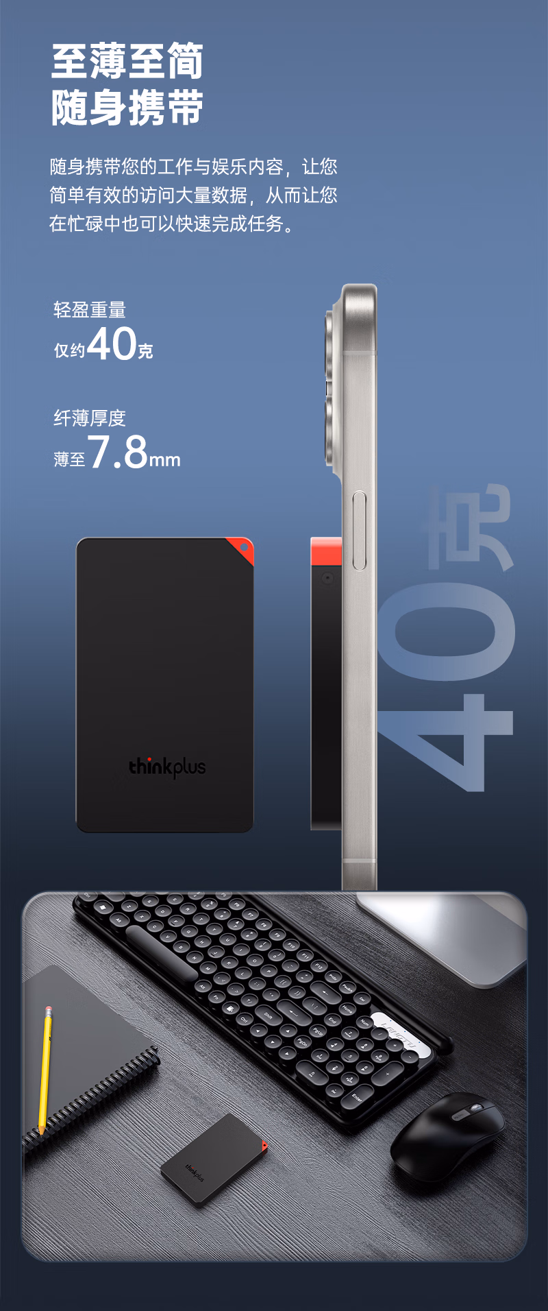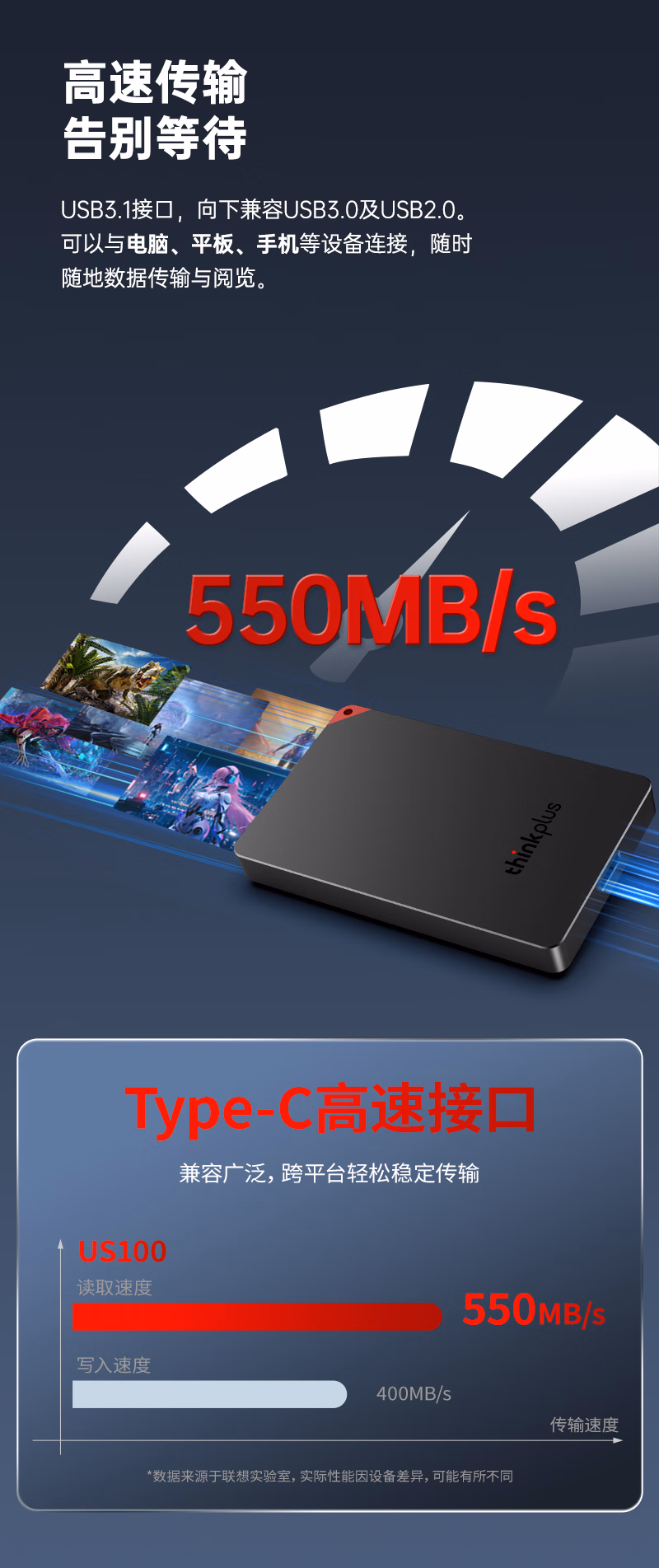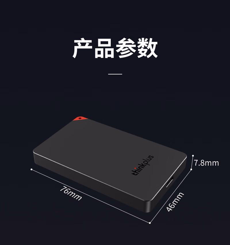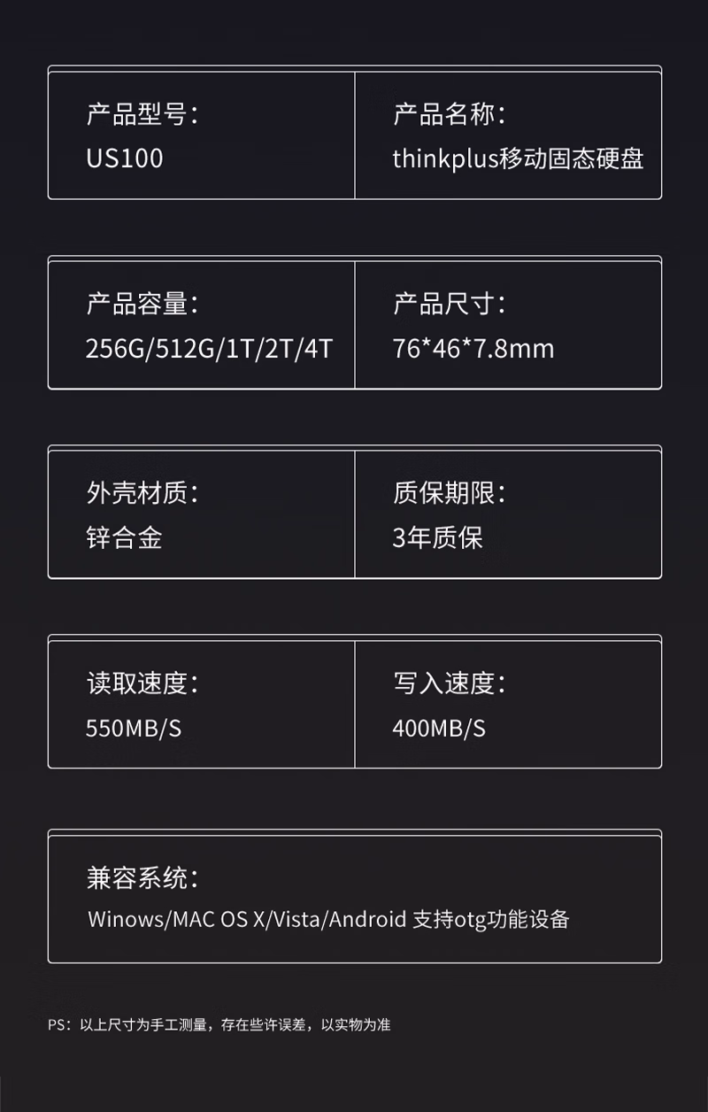 包装清单  :   ThinkPlus联想 512G移动固态硬盘 USB3.1高速PSSD移动硬盘小巧便携读取550MB/S US100黑色