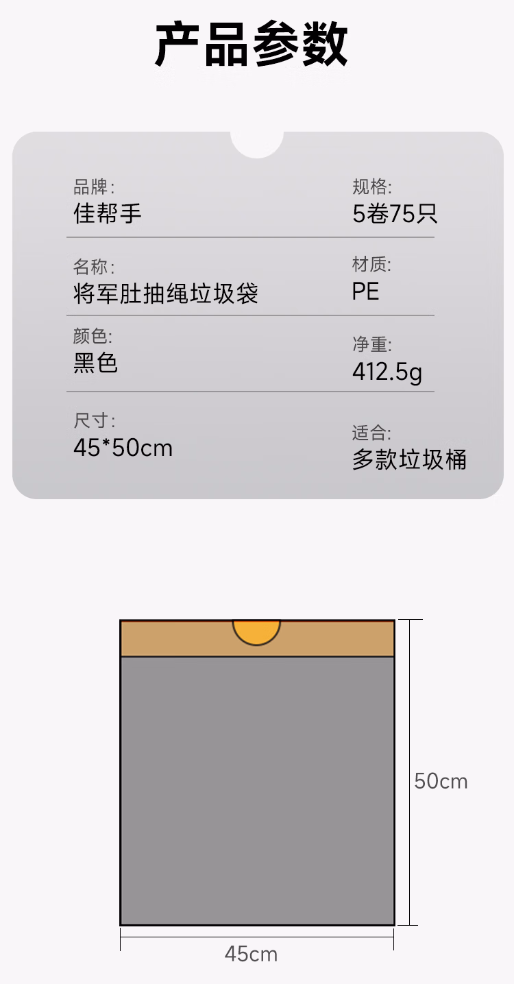 包装清单  :   佳帮手抽绳垃圾袋黑色45*50cm150只1丝断点撕家用加厚分类自动收口