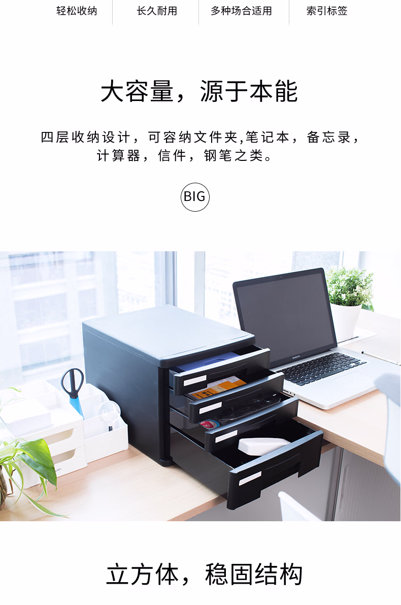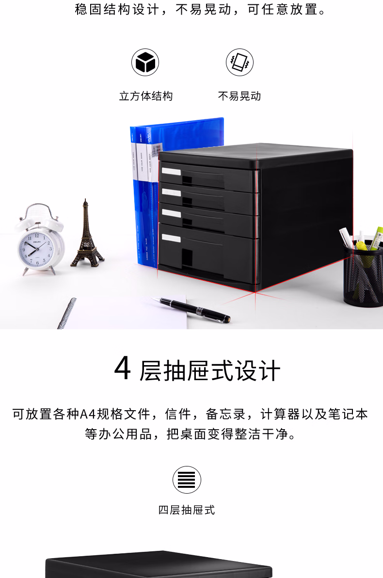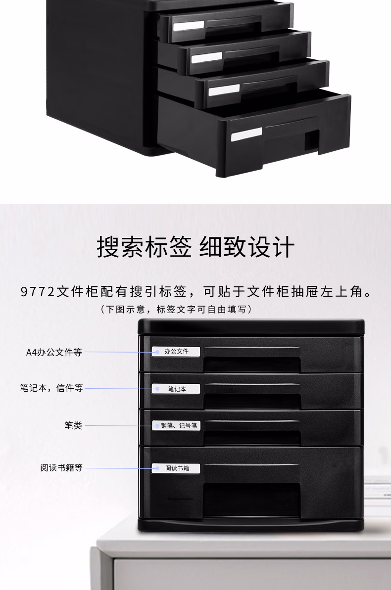 包装清单  :   得力(deli)4层办公桌书桌桌面收纳盒文件柜收纳柜抽屉式 A4拉手资料 带索引标签学科试卷分类收纳 黑9772A