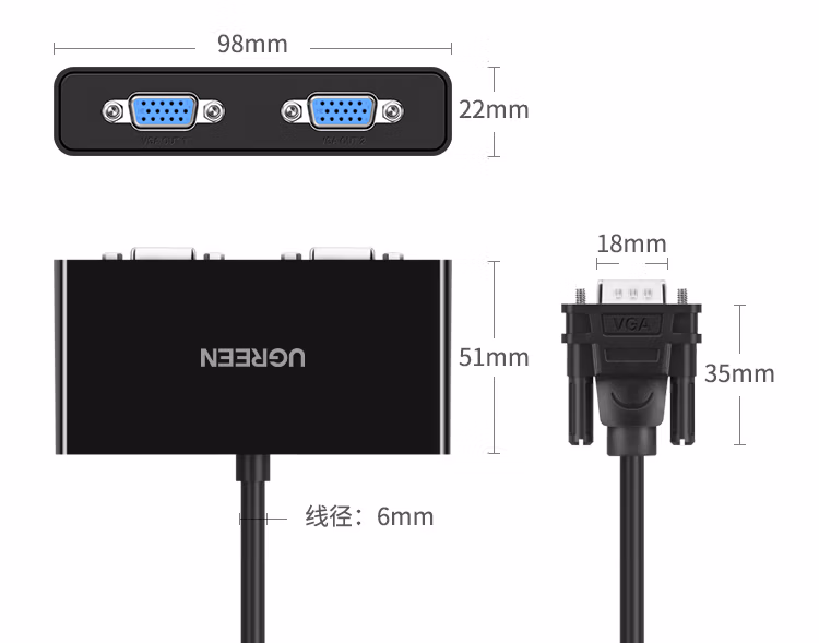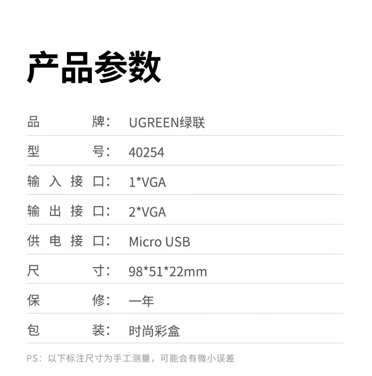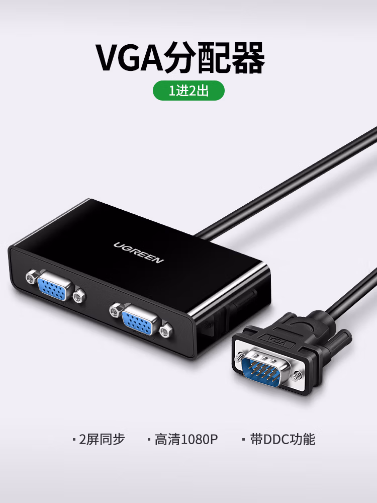 包装清单  :   绿联VGA分配器一分二 笔记本电脑台式机接显示器投影仪 高清视频转换器一进二出同屏器1分2分屏器40254