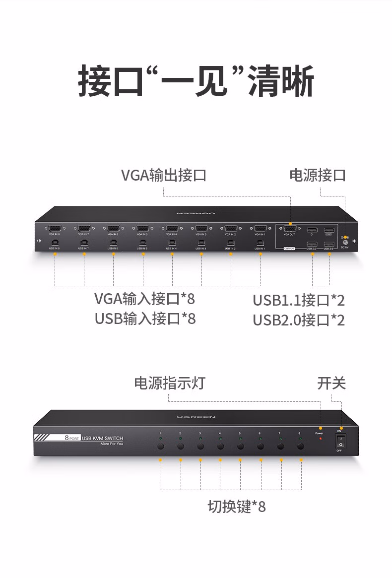 包装清单  :   绿联VGA KVM切换器高清8进1出八进一出视频切屏器 台式机笔记本电脑共享显示器键盘鼠标打印机70440