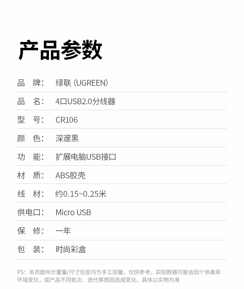 包装清单  :   绿联USB分线器2.0多接口转换器 扩展坞集线器4口HUB 笔记本电脑一拖四拓展坞多接口延长线带供电口