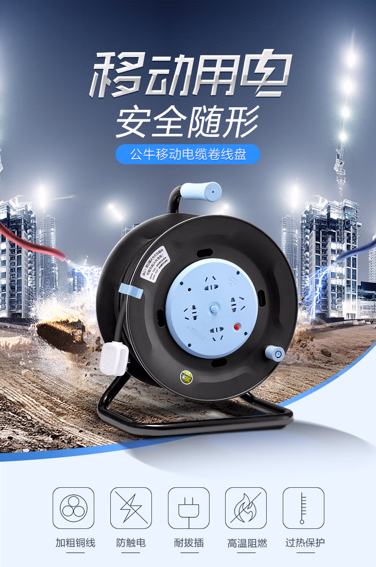包装清单  :   公牛(BULL)过热保护16A大功率电缆卷盘插座/插排 GN-804D 4位总控30米卷线盘工程专用