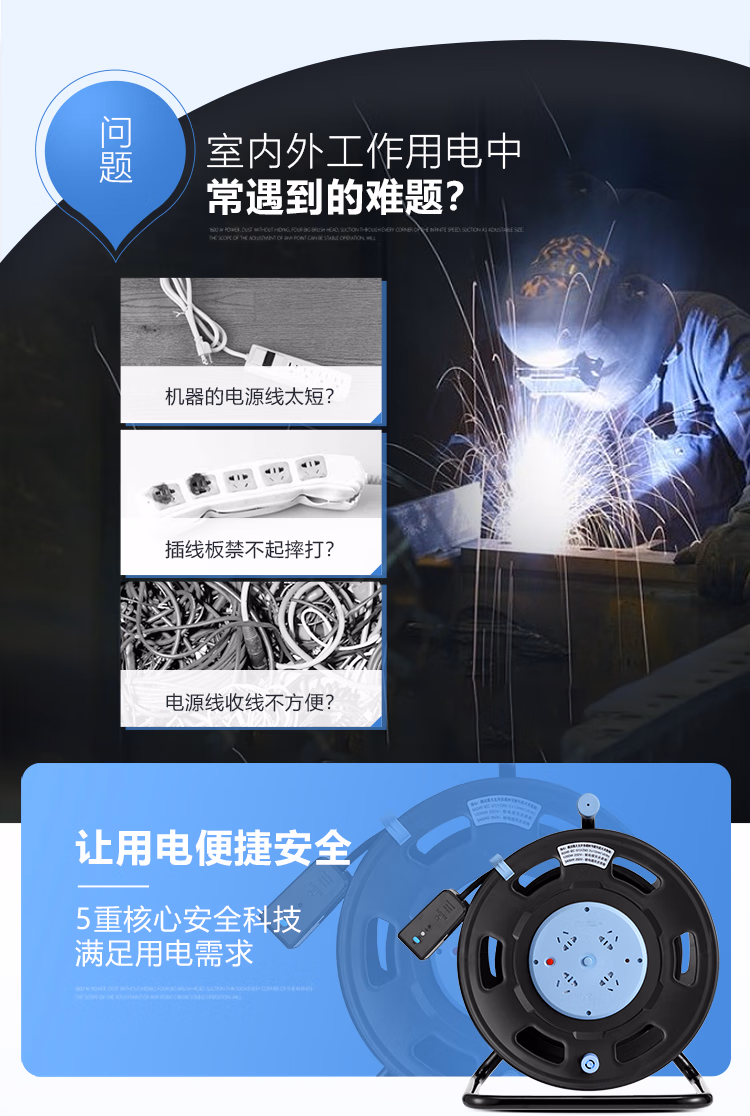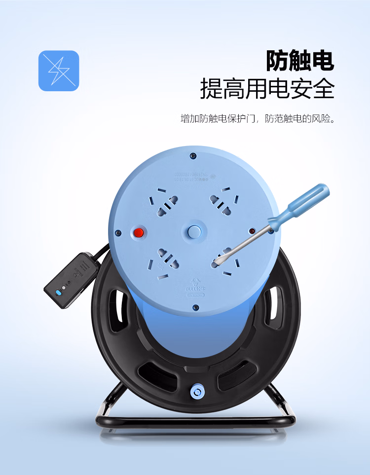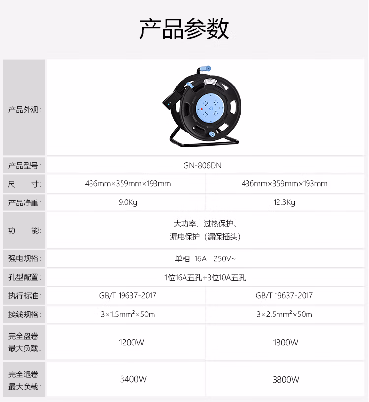 包装清单  :   公牛(BULL)过热保护 漏电保护16A大功率电缆卷盘插座/插排GN-806DN 4位50米线粗1.5平方毫米工程专用