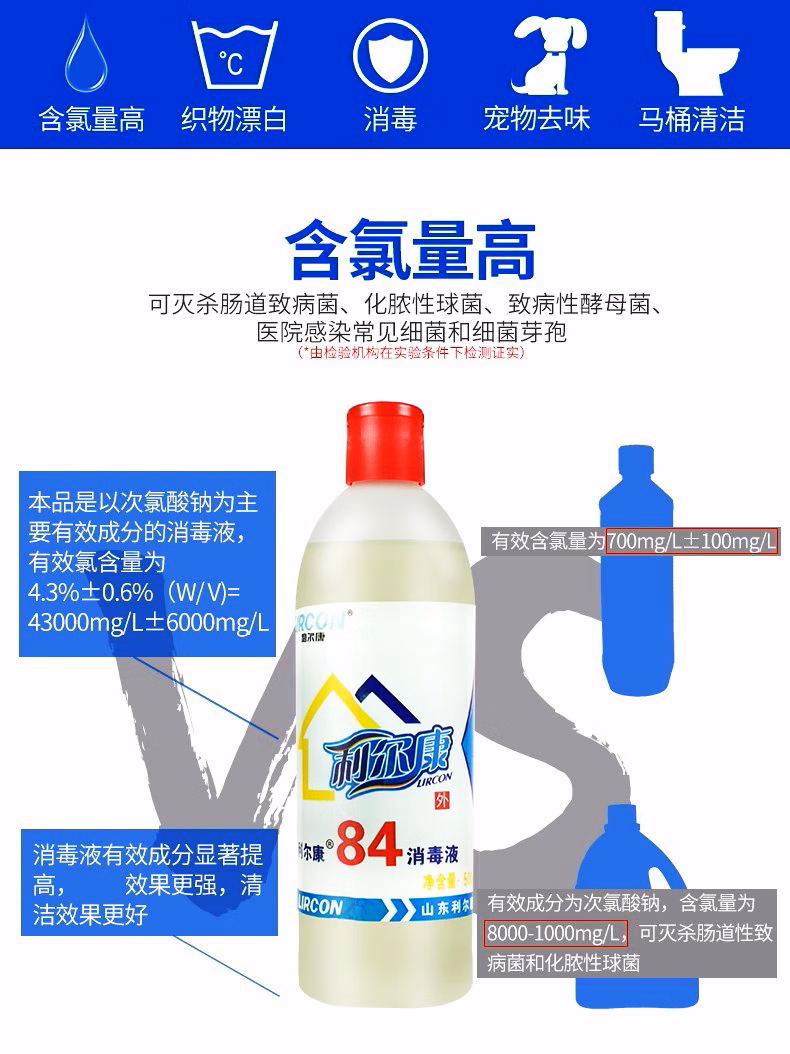 包装清单  :   利尔康84消毒液医院家用漂白衣物地面物品洁厕宠物养殖场杀菌消毒漂白水
