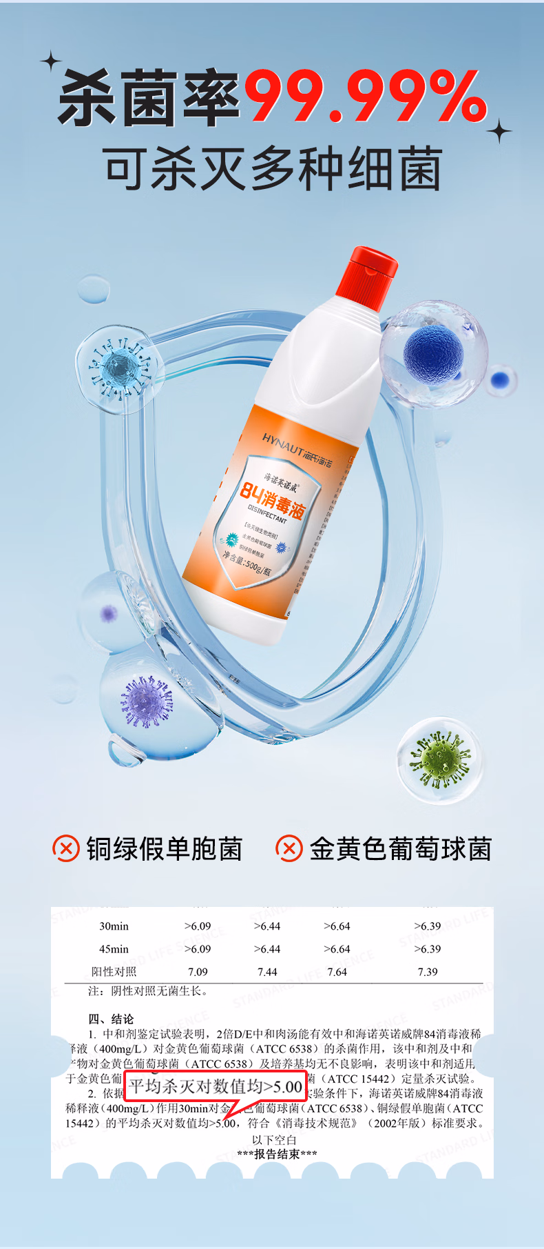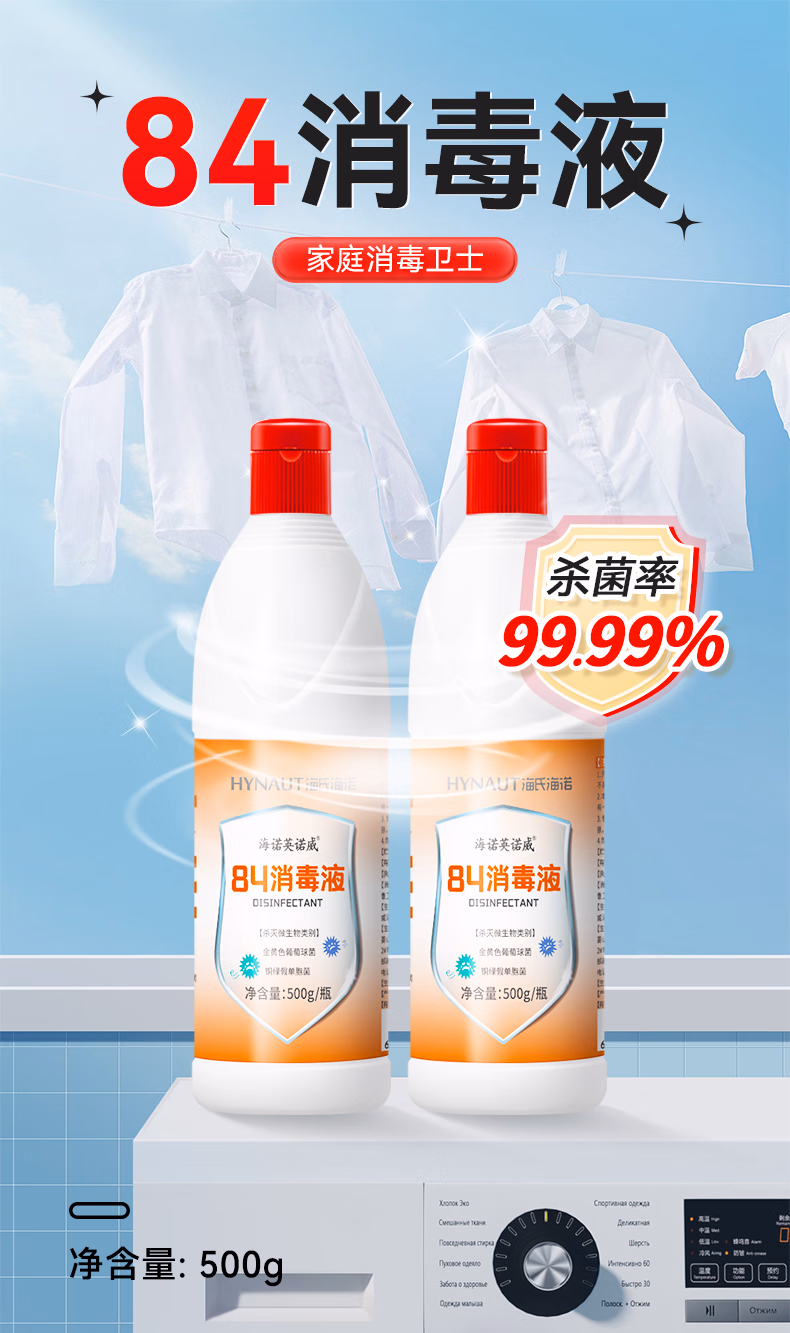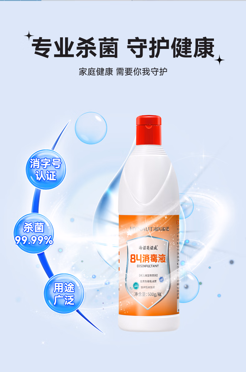 包装清单  :   海氏海诺 84消毒液500g甲流感衣物漂白除菌剂家居地板杀菌消毒水厕所除臭